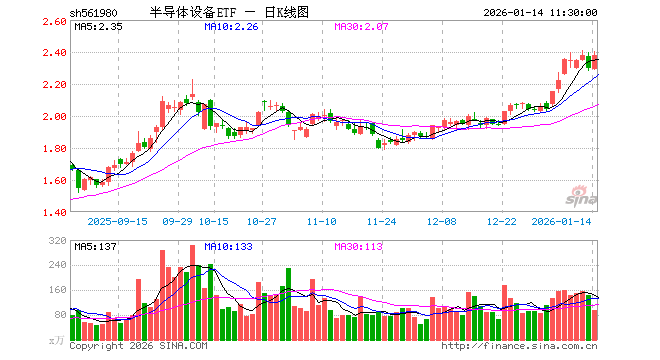 1月14日,截止午间收盘,半导体设备ETF(561980)涨3.57%,报2.381元,成交额2.24亿元。半导体设备ETF(561980)重仓股方面,中微公司截止午盘涨5.03%,北方华创涨1.74%,寒武纪涨1.56%,中芯国际涨2.25%,海光信息涨5.96%,长川科技涨6.39%,华海清科涨4.89%,拓荆科技涨6.48%,南大光电涨5.71%,安集科技涨3.27%。