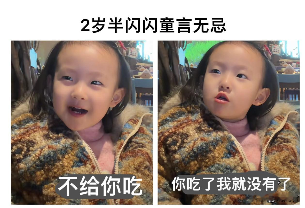 “不给你吃,给你吃我就没了” 2岁半的闪闪童言无忌,与黄一鸣餐桌对话。 闪闪活泼可爱,聪明伶俐,深得黄一鸣的喜爱。 黄一鸣经常带着女儿吃喝玩乐长见识。 这一天她们母女在餐厅里展开了一番对话交流。 闪闪爱吃葡萄干,黄一鸣也想吃,闪闪认真的回答“不给你吃”,黄一鸣追问“为啥”?闪闪立刻回答“你要吃我就没了”。 都说孩子天真无邪,两岁多的孩子确实很天真,她还没有产生复杂的社会心理,她说出来的话其实更贴近真实的人性。