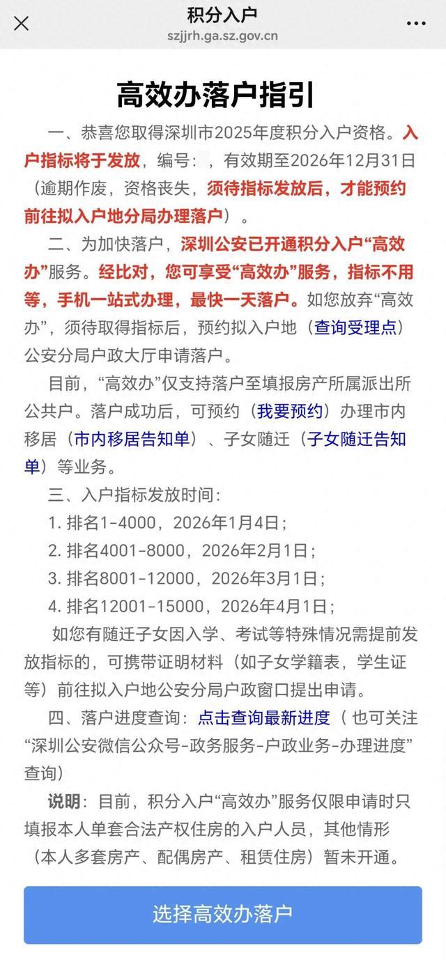 近期,深圳公安推出了“积分入户高效办”服务,仅限申请时只填报本人单套合法产权住房的入户人员。申请人通过手机或电脑,全流程网办,实现零跑腿、不见面、自动批,最快一天落户深圳。该服务自1月4日上线以来,已服务了超4400人,最快26分钟完成落户。申请人可在积分入户“我要落户”查看自己是否符合条件,同时公安部门也将推送指引短信。