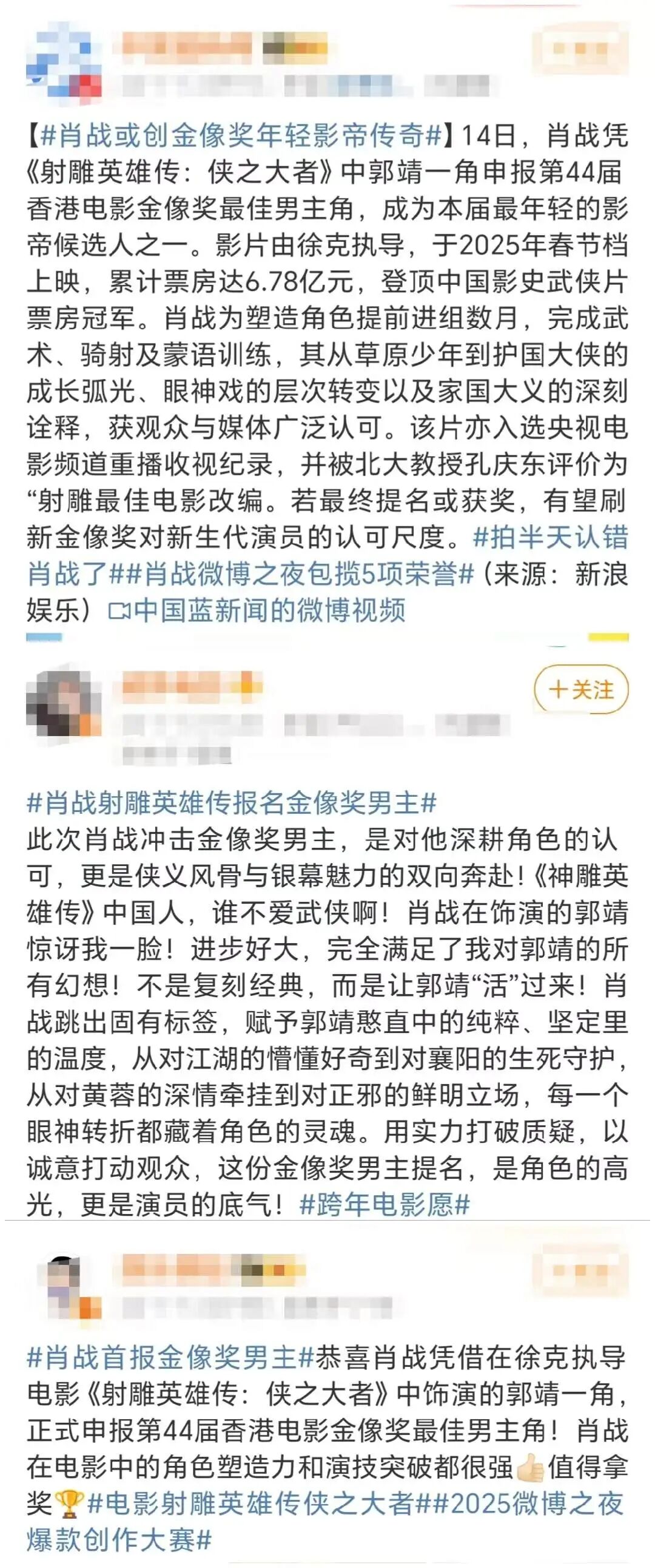 据报道,肖战在徐克指导的电影《射雕英雄传:侠之大者》中饰演郭靖一角,且凭此正式申报第44届香港电影金像奖最佳男主角,成为最年轻的影帝候选人之一。