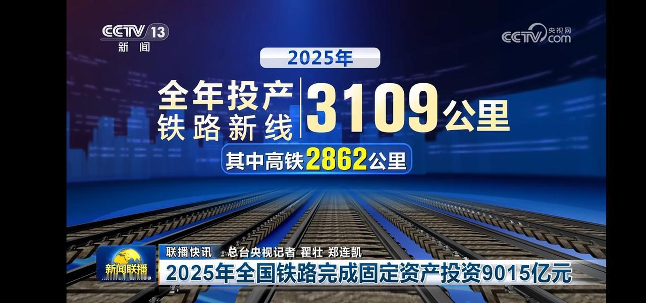 2025年铁路投资9015亿,同比增长6%,铁路建设加速推进! 全年投产铁路新线3109公路,其中高铁2862公里。 预计2026年投产超2000公里。