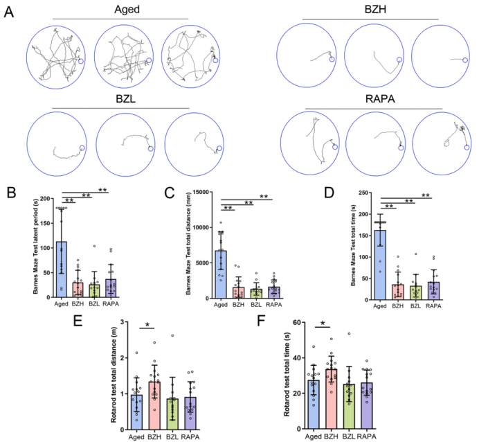 通过巴恩斯迷宫和旋转棒测试,研究人员证实,经过八子补肾干预的老年小鼠,其空间记忆能力和肌肉耐力均得到明显提升,表现出更优的行为学表现,提示该方剂有助于延缓与年龄相关的神经与运动功能衰退。