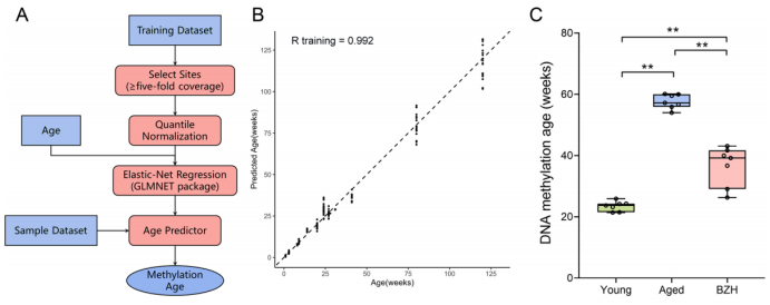 研究最引人瞩目的发现之一是八子补肾能够逆转表观遗传年龄。利用升级版的小鼠DNA甲基化时钟进行计算,研究人员发现接受八子补肾治疗的老年小鼠,其肝脏的DNA甲基化年龄比同龄对照组小鼠年轻了约21周。这从表观遗传层面直接证明了该药物的“减龄”效应。