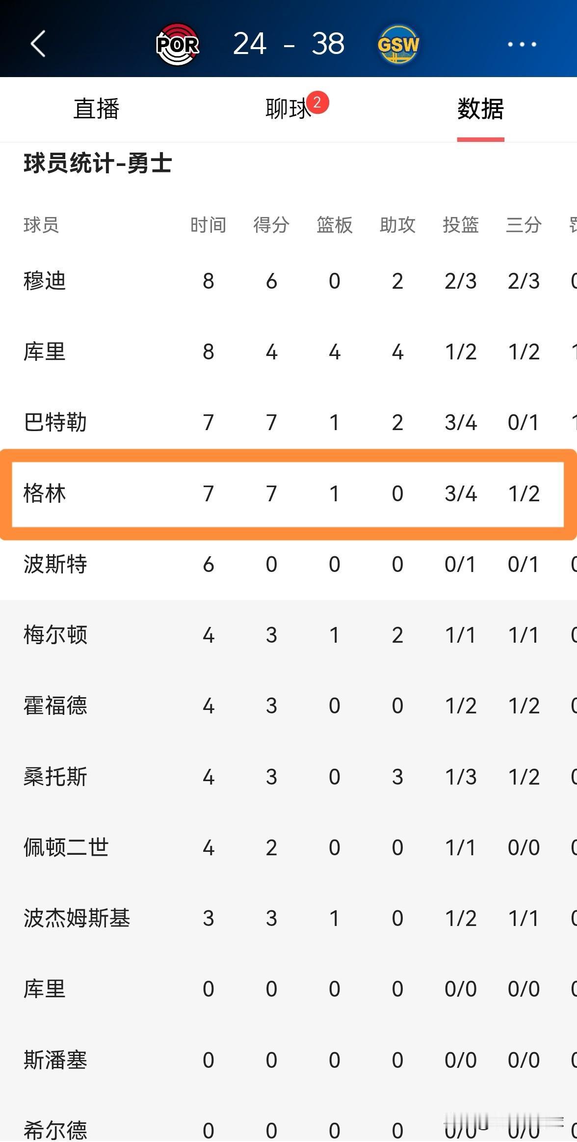 勇士老将追梦格林真是让人大吃一惊!在今天勇士主场迎战开拓者的比赛中,目前双方的第一节比赛已经结束,勇士以38:24领先对手。在第一节比赛中,追梦格林一反常态打出了让人非常吃惊的表现,他在首发出战的7分钟里,投篮4中3,其中三分球2中1非常高效的砍下7分,他的场上正负值为+10。 请问大家对追梦格林在首节比赛中的表现感到意外吗?