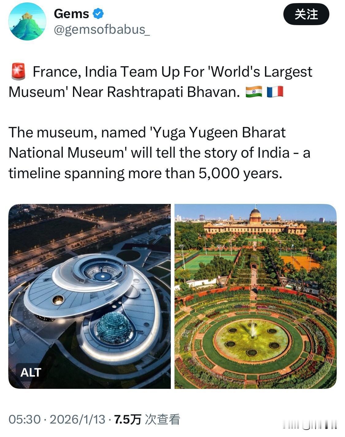 印度政府正与法国紧密合作,共同打造 “万代印度国家博物馆”(Yuge Yugeen Bharat National Museum,意为“永恒的印度”)。 该项目计划成为世界上最大的博物馆,目前相关进展如下: 1. 地点与规模 选址: 博物馆位于新德里的核心区域——拉辛纳山(Raisina Hill),即拉什特拉帕蒂·巴万(印度总统府)的正前方。 建筑利用: 它由历史悠久的北楼(North Block)和南楼(South Block)改造而成。这两座大楼曾是印度政府的中枢,驻有总理办公室(PMO)以及外交、国防、内政和财政等关键部委。 面积: 占地约 15.5 万平方米,拥有 950 间展室,分为地下层、地上一层、二层和三层。 根据相关报道,该博物馆项目的整体建设成本预计接近 270 亿卢比(约合 2700 Crore 印度卢比,约合 3.2 亿美元)。 技术与设计投入: 法国政府和“法国博物馆发展局”(France Muséums)提供技术支持和设计合作,这部分的具体费用细节尚未完全公开,但其合作模式参考了卢浮宫等顶级机构的运营标准。 2. 展示内容 时间线: 博物馆将系统讲述印度跨越 5000 多年的文明史。 分段: 全馆将划分为 8 个主题板块,涵盖从古印度的知识传统、中世纪艺术到现代独立斗争及当代发展的全过程。 文物: 预计展出超过 10 万件珍贵文物,包括来自现国家博物馆的藏品以及遍布全印度的艺术珍品,如印度河谷文明的陶器、笈多王朝的雕塑和朱罗王朝的青铜像等。 3. 法印合作细节 合作方: 印度文化部与法国博物馆发展局(France Muséums)签署了合作协议。该机构由包括卢浮宫、奥赛博物馆在内的 13 家法国顶级文化机构组成。 技术支持: 法方将提供博物馆设计、空间改造、文物管理及国际先进运营经验方面的专业指导,类似于将巴黎旧火车站改造成奥赛博物馆的“适应性再利用”模式。 4. 2026 年最新动态 开放时间: 截至 2026 年初,北楼的搬迁和初步修整工作已在进行。博物馆的第一间展厅预计将于 2026 年底面向公众开放。 预计流量: 建成后,该博物馆预计每周将吸引约 5 万名游客,成为全球性的文化地标。