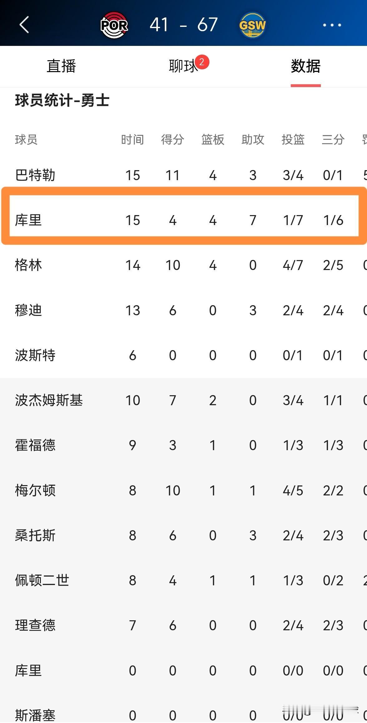 勇士当家球星库里真是太让人捉摸不透了!在今天勇士主场迎战开拓者的比赛中,目前双方半场战罢,勇士以67:41领先对手26分。在前两节比赛中,库里首发出战15分钟,投篮7中1,其中三分球6中1、罚球1中1非常低效的得到4分,不过有4篮板7助攻,他的场上正负值为全队第二高的+18。 对于库里的表现,我真是捉摸不透,库里竟然在仅得4分的情况下拥有+18的正负值,这个现象真是让我百思不得其解。