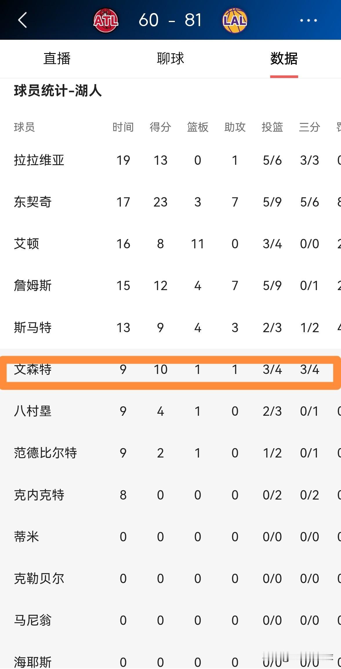 湖人大将文森特真是不负众望!在今天湖人主场迎战老鹰的上半场比赛中,手感火热的文森特替补出战9分钟,三分球4中3,其中罚球1中1非常高效的砍下10分,还有1篮板1助攻,没有出现任何的失误,他的场上正负值为+17。 作为湖人第二阵容的核心球员之一,本场比赛文森特完全没有辜负主帅雷迪克的期望和信任。