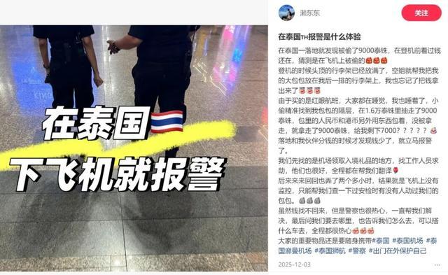 2025年12月3日,网友“濑东东”称,“在泰国一落地就发现被偷了9000泰铢,在登机前看过钱还在,猜测是在飞机上被偷的”。