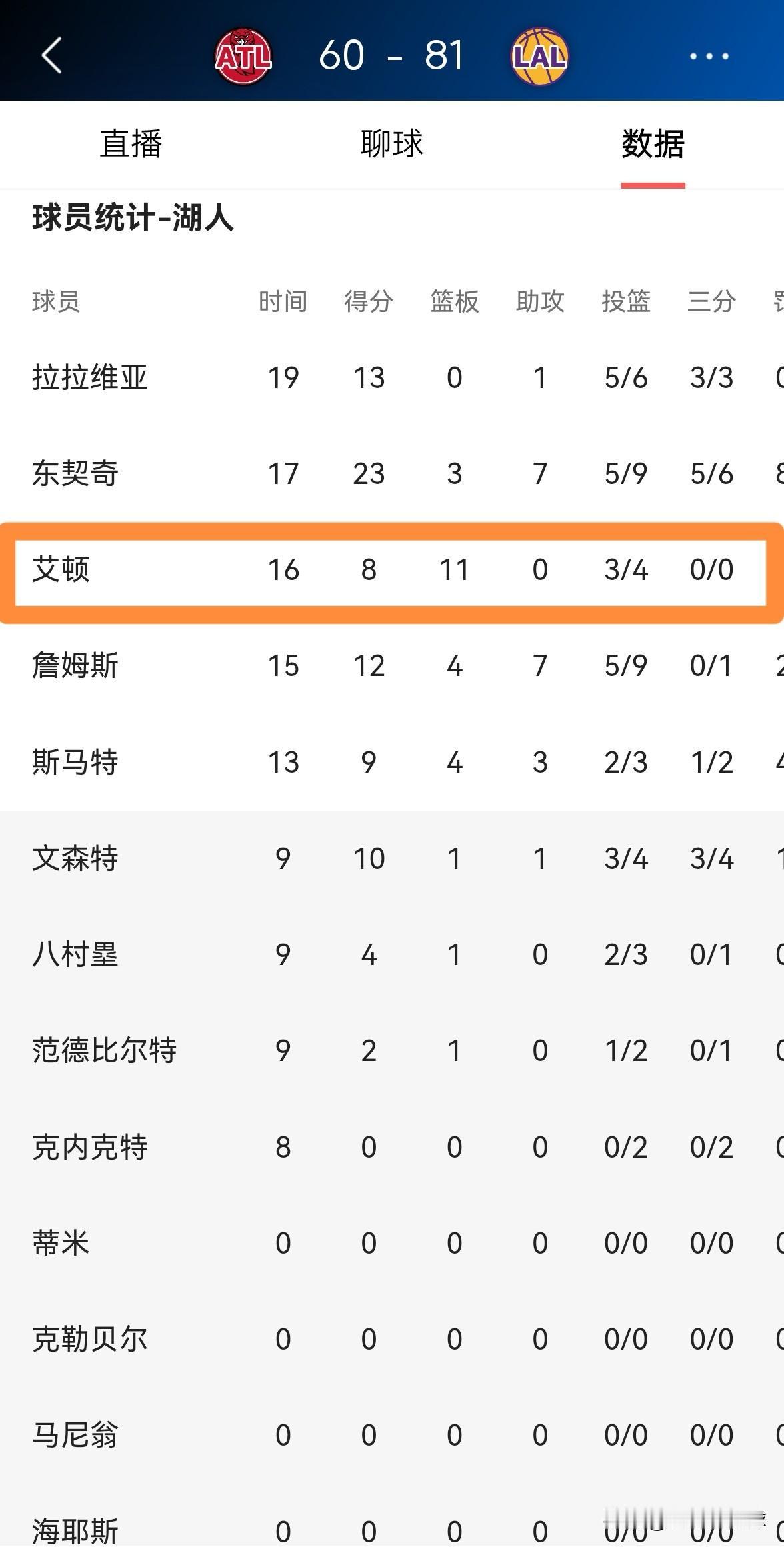 湖人当家中锋艾顿终于变得强硬了!在今天进行的湖人和老鹰的比赛中,目前双方的上半场比赛已经结束,湖人以81:60领先对手21分。在前两节比赛中,艾顿在攻防两端都打出了超强的侵略性,他在首发出战的16分钟里,投篮4中3,其中罚球2中2得到8分11篮板,他的场上正负值为+18。 坦白说,当艾顿能够在比赛中打得强硬时,湖人能够击败任何对手。