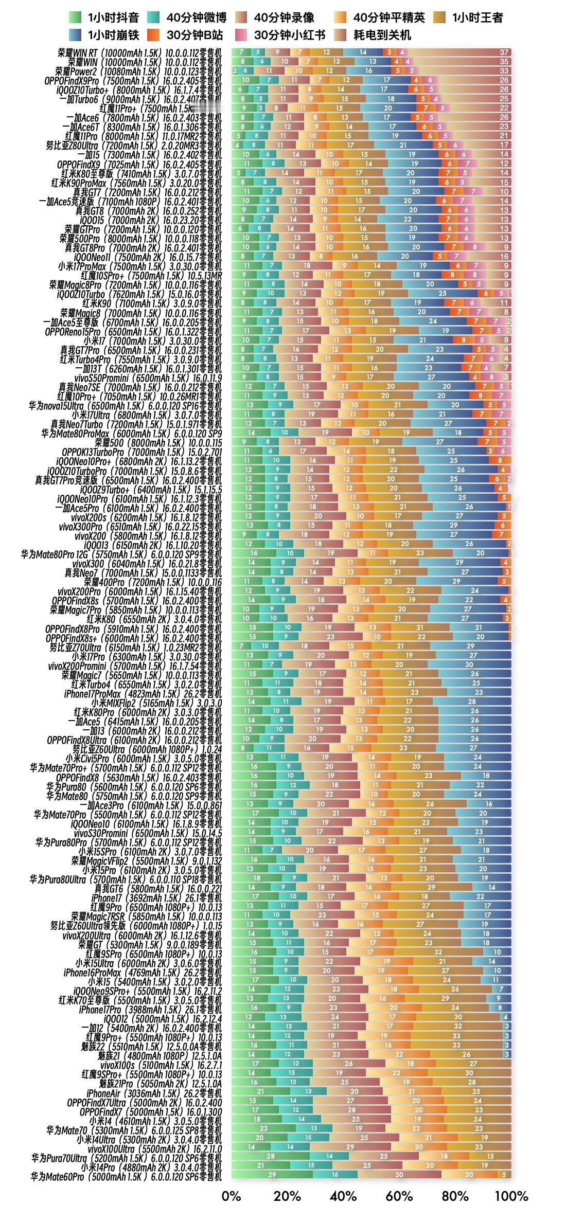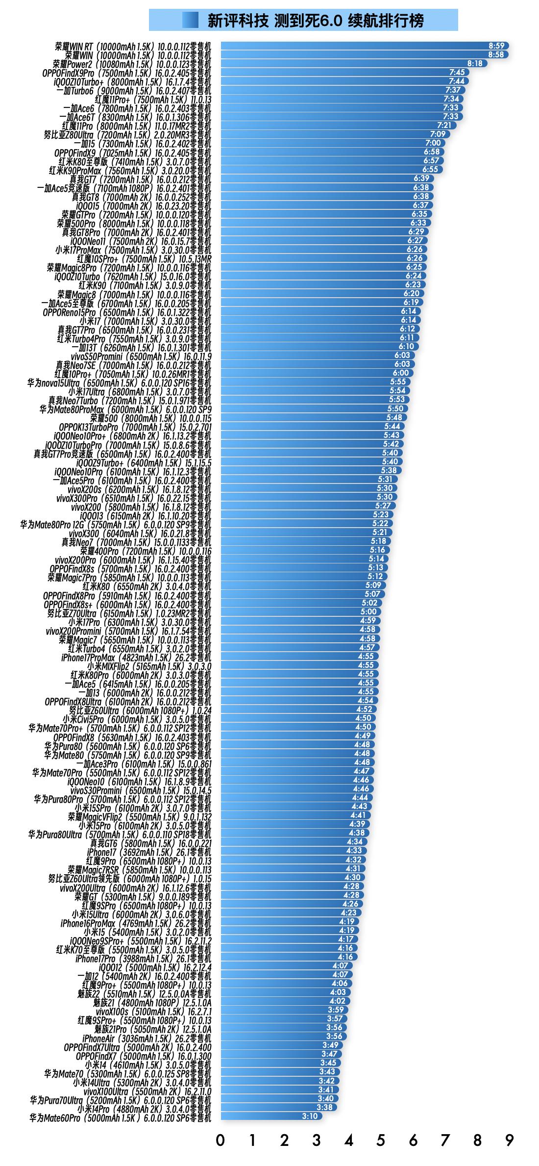『1月14日最新手机续航榜单』 新评科技续航排行榜 本次6.0标准续航排行榜新增2台手机续航成绩,复测16台手机续航成绩;⭐️完整详细榜单请访问新评科技数据库小程序⭐️ 『6.0标准续航榜单』新增 ① 荣耀Power2零售机 10.0.0.123版本总续航时间8小时18分钟,最新排名第2名 ② 一加Turbo6零售机 16.0.2.407版本总续航时间7小时37分钟,最新排名第7名 『6.0标准续航榜单』复测 ① 红米K80至尊版零售机 第3次复测 3.0.7.0版本续航时间减少3分钟,总续航时间6小时57分钟,最新排名第15名【对比历史成绩续航不变】 ② 荣耀GTPro零售机 第3 次复测 10.0.0.120版本续航时间减少10分钟,总续航时间6小时35分钟,最新排名第21名【对比历史成绩续航缩短】 ③ 华为nova15Ultra零售机 第2次复测 6.0.0.120 SP16版本续航时间增加9分钟,总续航时间5小时55分钟,最新排名第39名【对比历史成绩续航不变】 ④ 小米17Ultra零售机 第2次复测 3.0.7.0版本续航时间增加6分钟,总续航时间5小时54分钟,最新排名第40名【对比历史成绩续航不变】 ⑤ 真我GT7Pro竞速版零售机 第3次复测 16.0.2.400版本续航时间减少5分钟,总续航时间5小时40分钟,最新排名并列第47名【对比历史成绩续航缩短】 ⑥ iQOOZ9Turbo+ 第2次复测 15.1.15.5版本续航时间减少4分钟,总续航时间5小时40分钟,最新排名并列第47名【对比历史成绩续航不变】 ⑦ iQOONeo10Pro零售机 第2次复测 16.1.12.3版本续航时间减少6分钟,总续航时间5小时38分钟,最新排名第49名【对比历史成绩续航不变】 ⑧ vivoX200Ultra零售机 第2次复测 16.1.12.6版本续航时间增加13分钟,总续航时间4小时28分钟,最新排名第96名【对比历史成绩续航增加】 ⑨ iPhone16ProMax零售机 第3次复测 26.2版本续航时间减少8分钟,总续航时间4小时19分钟,最新排名并列第101名【对比历史成绩续航不变】 ⑩ iQOONeo9SPro+ 第2次复测 16.2.11.2版本续航时间不变,总续航时间4小时17分钟,最新排名第102名【对比历史成绩续航不变】 11 红米K70至尊版零售机 第2次复测 3.0.5.0版本续航时间减少17分钟,总续航时间4小时16分钟,最新排名并列第103名【对比历史成绩续航缩短】 13 iQOO12 第3次复测 16.2.12.4版本续航时间减少1分钟,总续航时间4小时07分钟,最新排名并列第105名【对比历史成绩续航不变】 14 一加12 第3次复测 16.0.2.400版本续航时间减少1分钟,总续航时间4小时07分钟,最新排名并列第105名【对比历史成绩续航不变】 15 vivoX100s 第2次复测 16.2.7.1版本续航时间减少4分钟,总续航时间3小时59分钟,最新排名第110名【对比历史成绩续航不变】 16 华为Mate70零售机 第2次复测 6.0.0.125 SP8版本续航时间减少21分钟,总续航时间3小时43分钟,最新排名第118名【对比历史成绩续航缩短】 新评科技有6.0标准续航排行榜,可以查看每款手机每个环节功耗,5.1长续航版(低压力版)排行榜,5.0折叠屏续航排行榜,5.1媒体机续航排行榜,所有排行榜共计200台手机中,有113台是零售机,从24年1月到26年1月,我们已经花费84.6万元人民币购买零售机。 新评科技续航排行榜,是全行业零售机最多、复测系统版本最新的续航排行榜,并且公布全程测试录像。