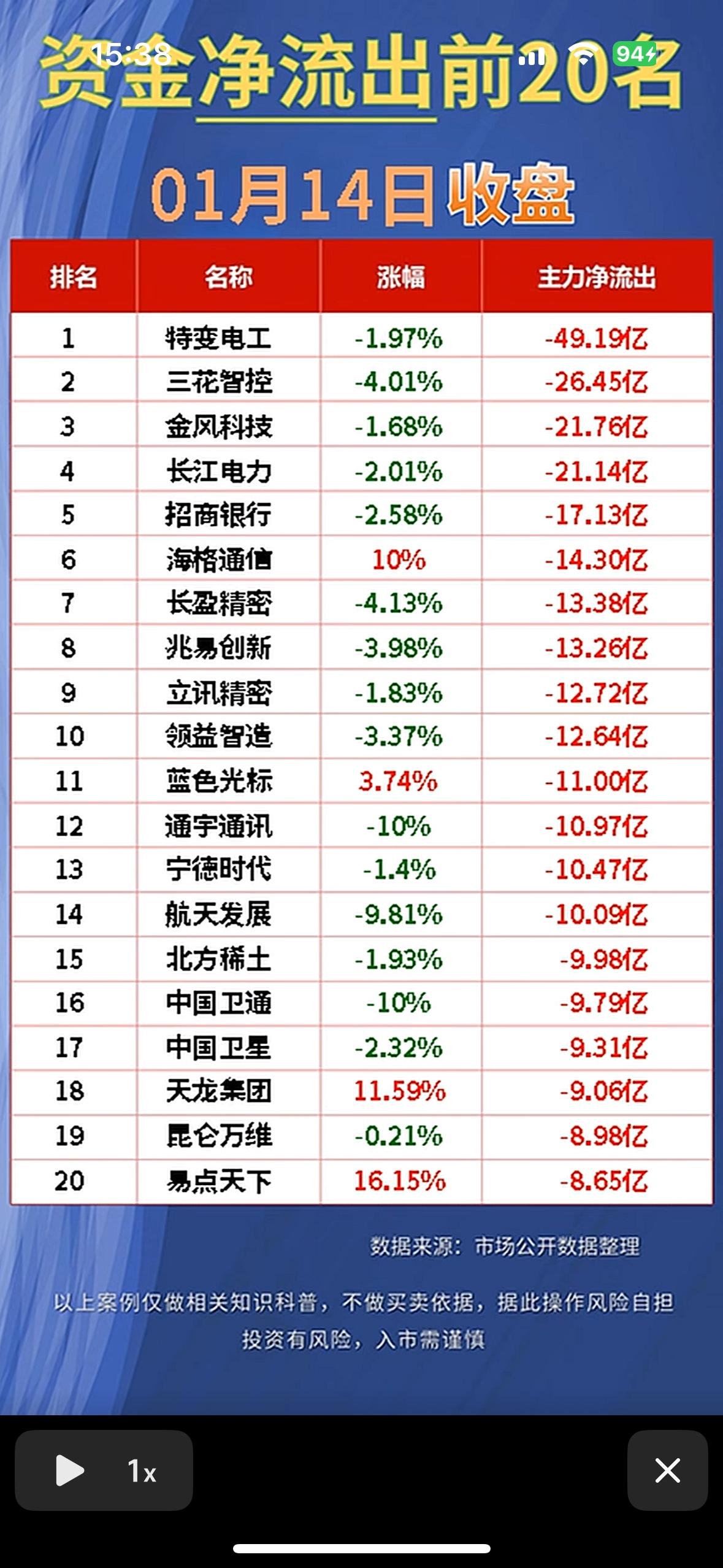 “1月14资金净流出前20名”揭晓!💰📈📉 科技股领涨,主力资金抢筹明显