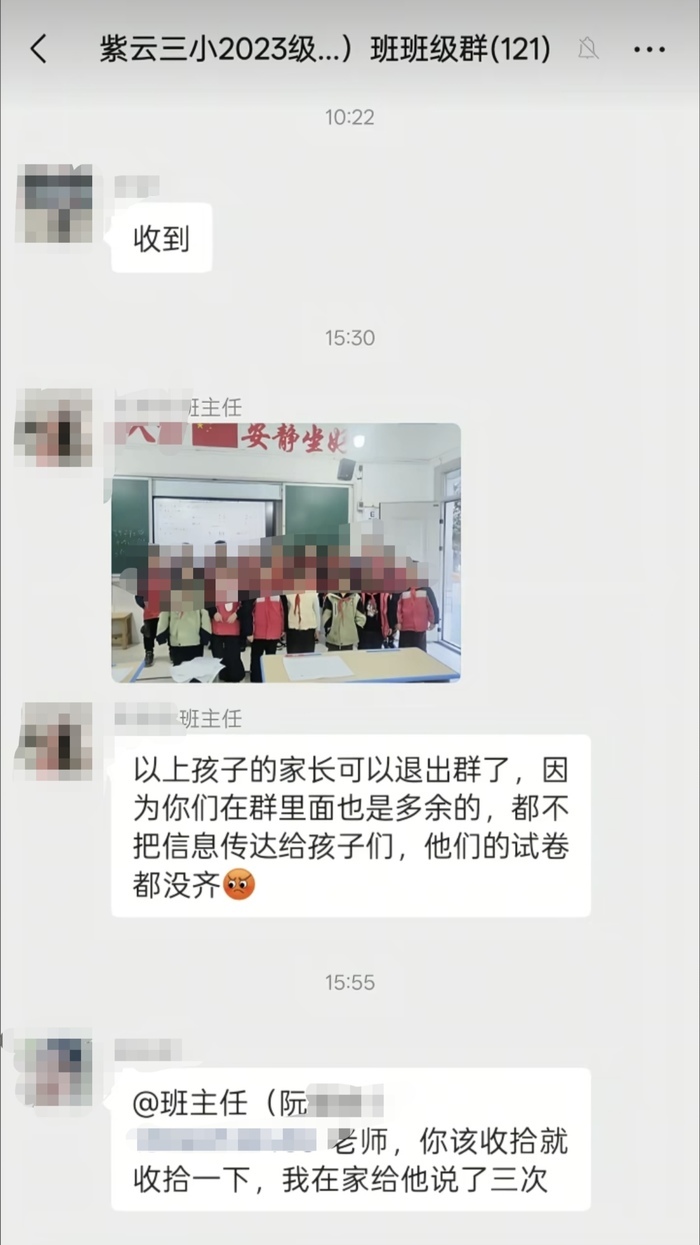 据上述网友所发布的微信群聊天截图显示,在一个名为“紫云三小2023级某班级群”内,一位头像名称显示为“阮某某班主任”的人士在发出一张包含16名学生的集体照片后,继而以文字表述称“以上孩子的家长可以退出群了,因为你们在群里面也是多余的,都不把信息传达给孩子们,他们的试卷都没齐”。