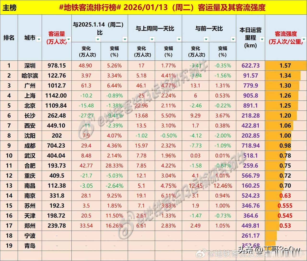 广州地铁客流量周二冲上千万人次以上,为1012万多[呲牙][呲牙][呲牙] 爆料 身边事 排行榜 周二 广州地铁 2026年1月13日 星期② 全国重点城市轨道交通客流量排行榜: 上海:1142.00万 北京:1109.84万 广州:1012.70万广州地铁 深圳:978.15万深圳地铁 成都:704.23万 西安:449.10万 重庆:409.50万重庆爆料 武汉:404.04万武汉地铁 南京:331.80万南京 长沙:262.48万长沙地铁 郑州:239.78万郑州爆料 沈阳:202.00万 天津:198.72万天津身边事 合肥:193.73万合肥地铁 苏州:192.30万苏州地铁 青岛:122万+ 哈尔滨122.76万哈尔滨爆料 宁波:112万+宁波身边事 南昌:112.38万