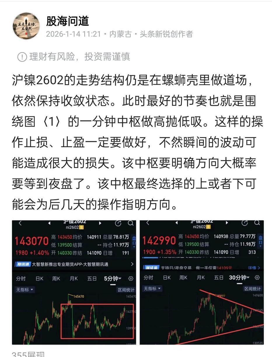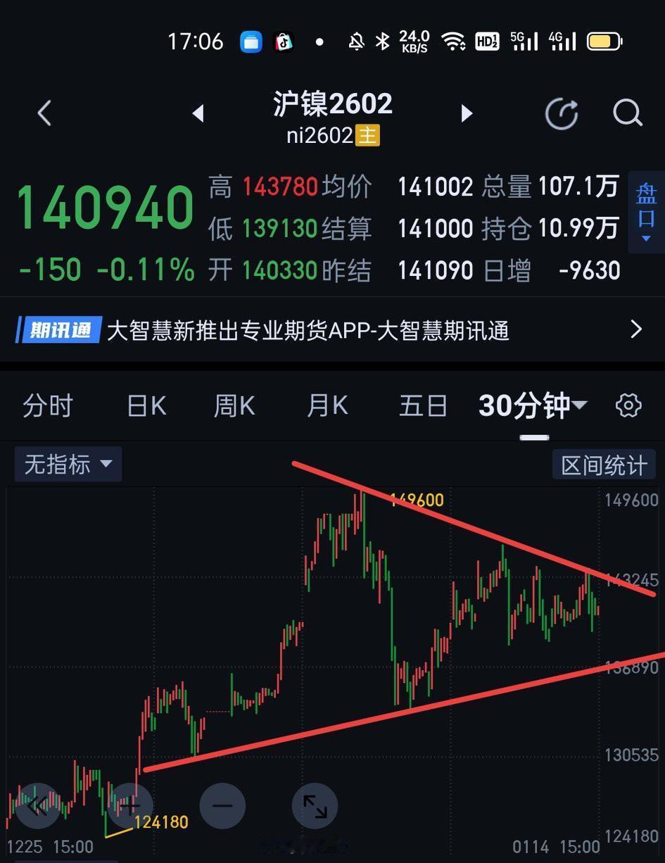 沪镍2602下午收盘也没太多说的,走势基本与中午判断一致。需要提示,要打破惯性思维,不要一厢情愿认为夜盘仍会继续围绕该中震荡。变盘的时间窗口有可能在夜盘打开。该中枢一旦破坏,产生的方向可能会影响后面几天的操作。所以如果对判断后市走势方向把握性不大,还是等该中枢指明方向后再操作会更安全些。
