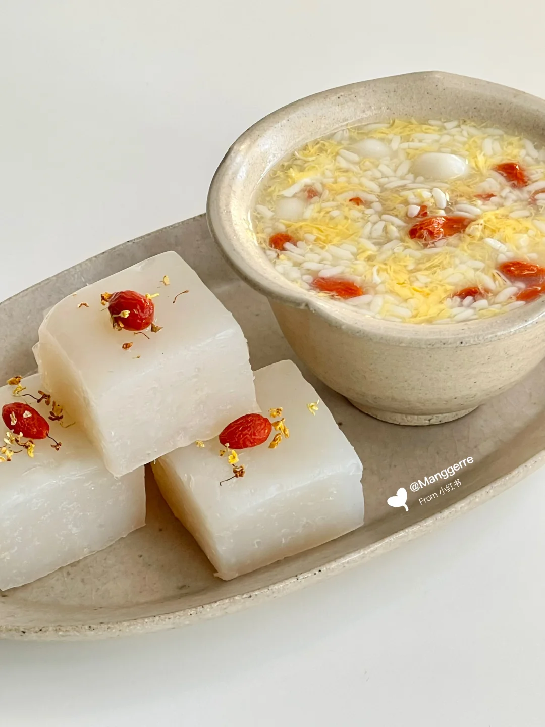 软糯的酒酿小汤圆冒着热气,一口甜到心窝~晶莹的雪梨糕,DuangDuang的像果冻!咬下去满嘴清甜的梨香,冰冰凉凉,喉咙好舒服~