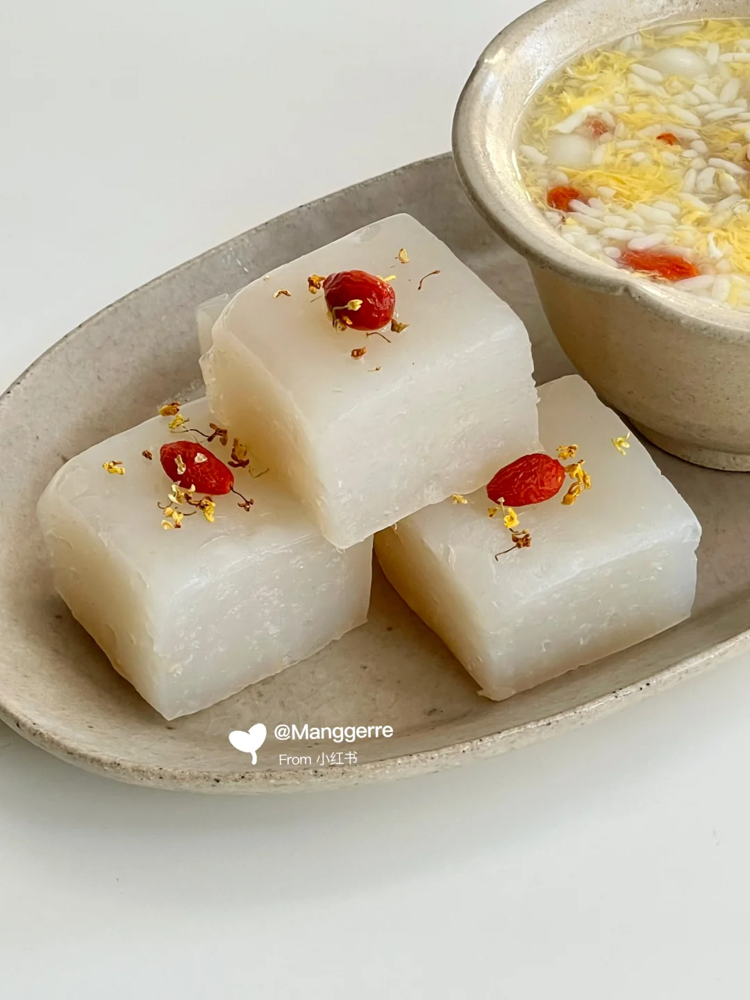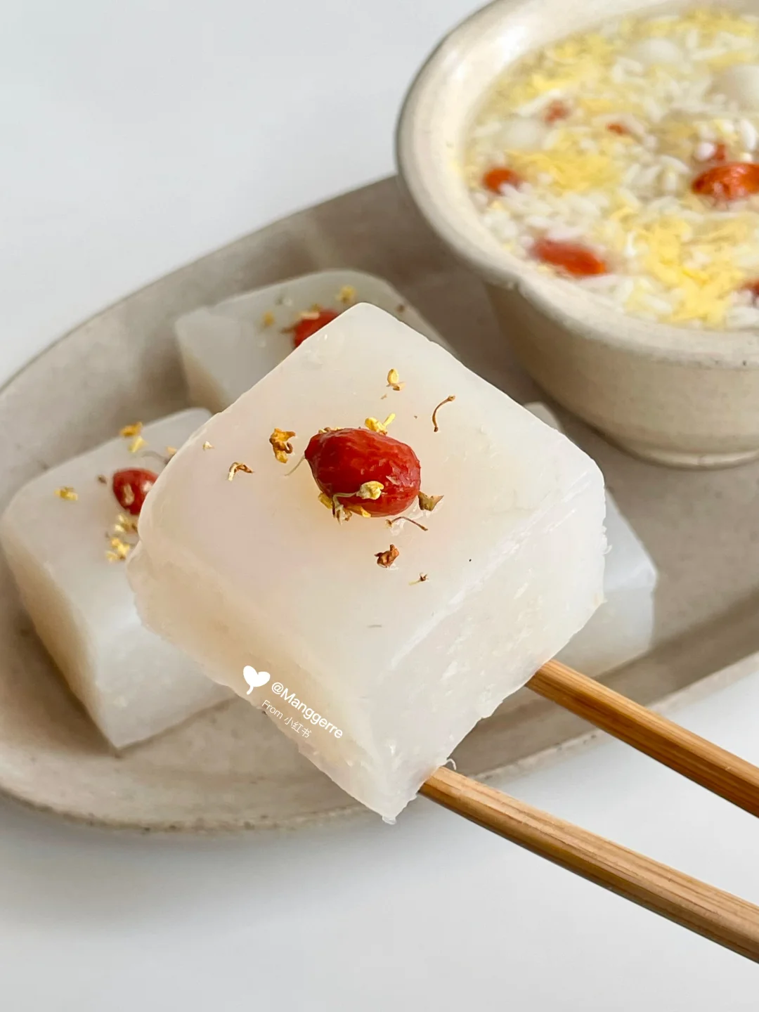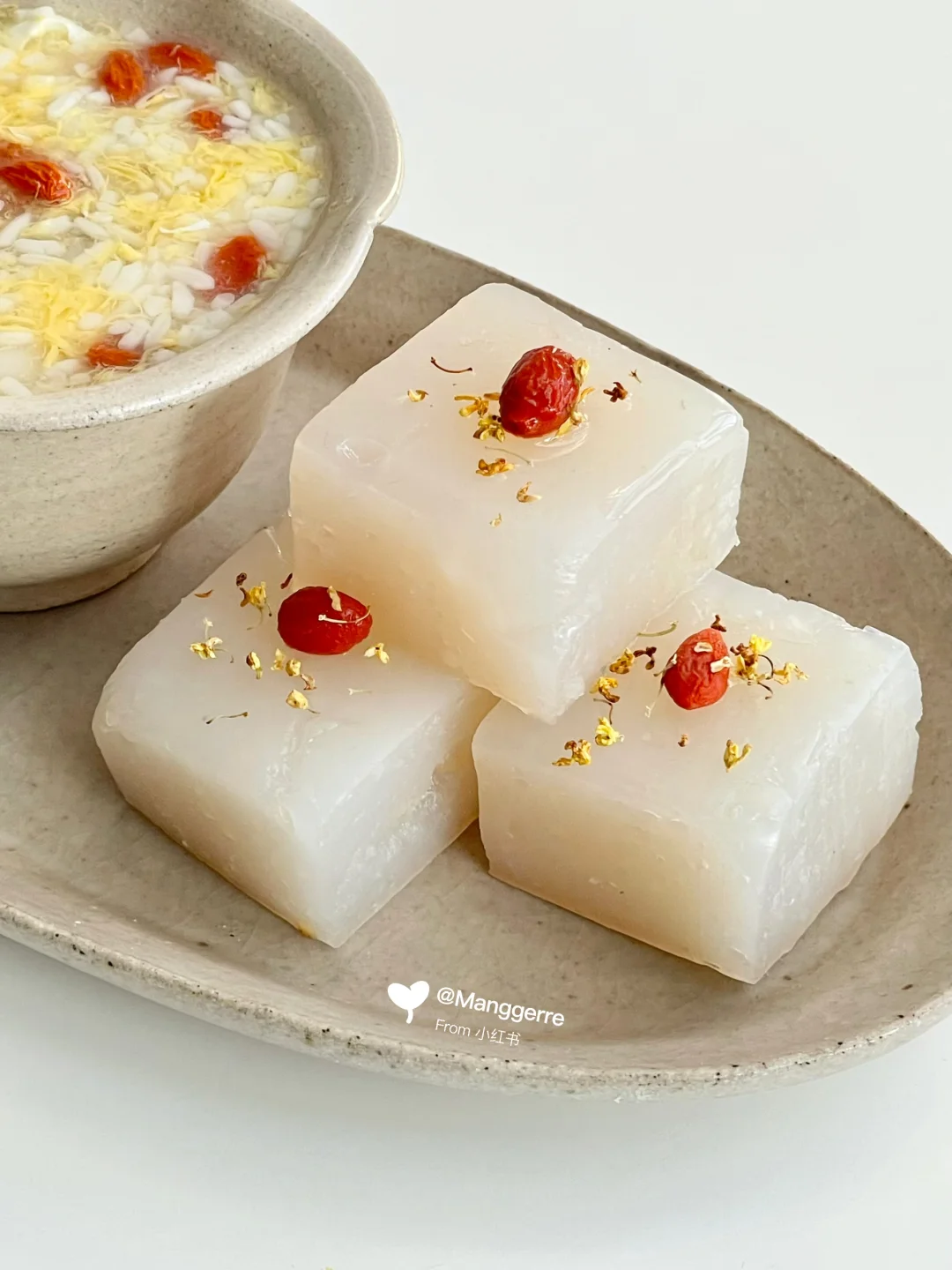 3、冷藏几小时后,切块,枸杞装饰