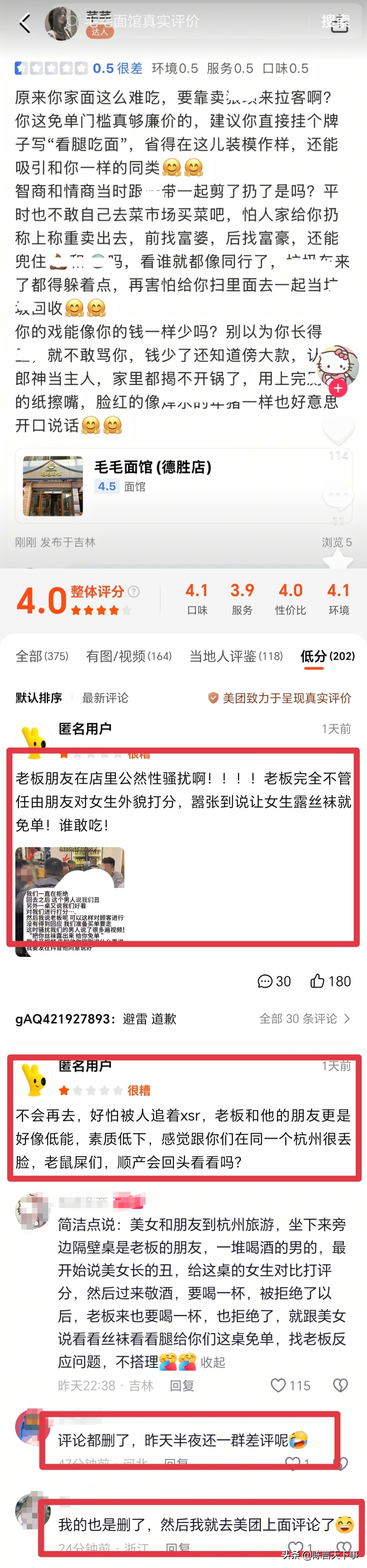 但这事的影响,不是删除一两条差评就能平息的,老板更应该做的是澄清与骚扰男子的关系,解释当时为什么没有出来制止。