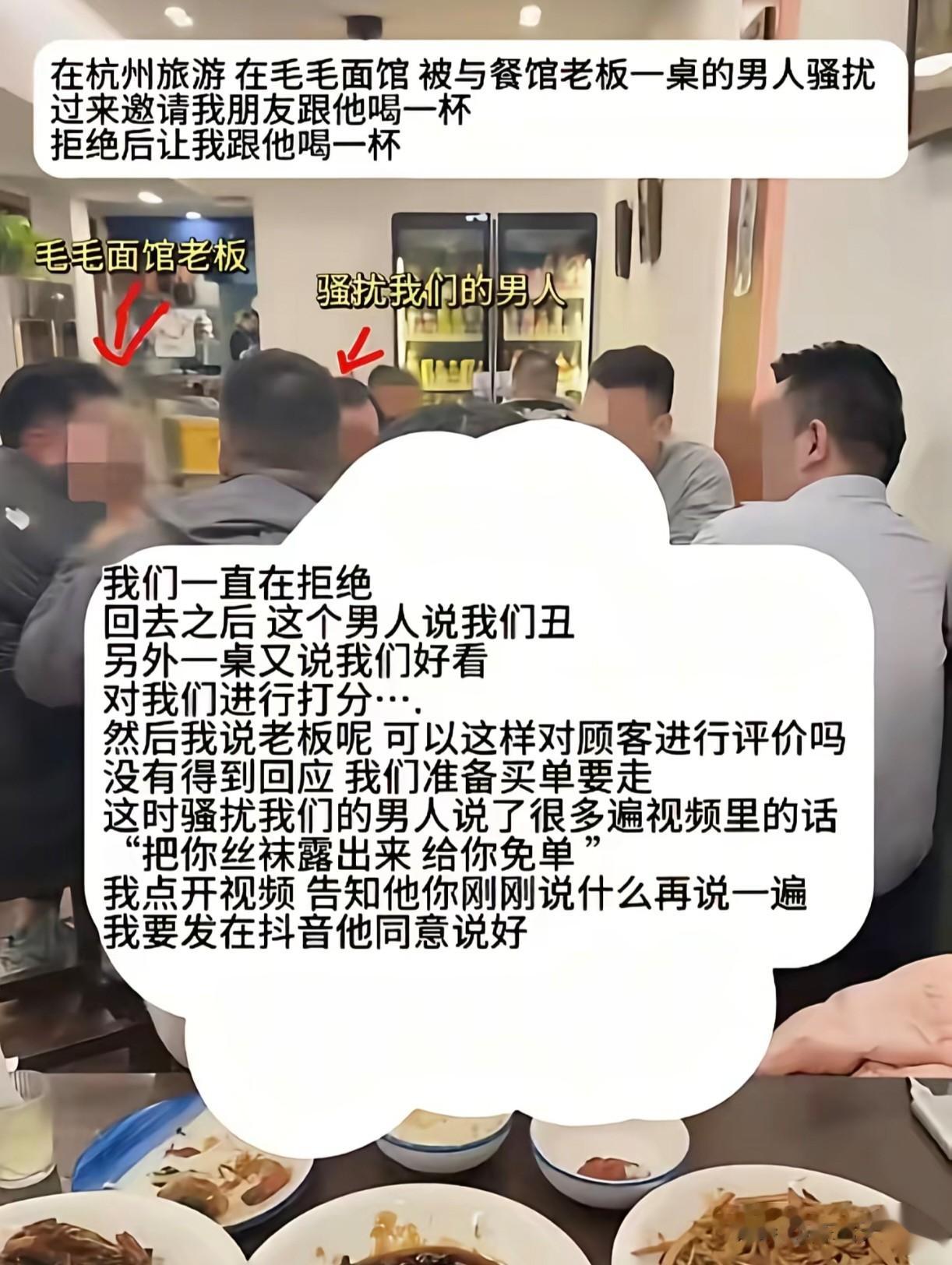 这究竟是怎么一回事呢?起因是女子和朋友来到杭州旅游,在一家面馆用餐时遭到一桌男性顾客的骚扰,先是邀请女子朋友来喝酒,被拒绝后再次邀请女子也喝一杯。