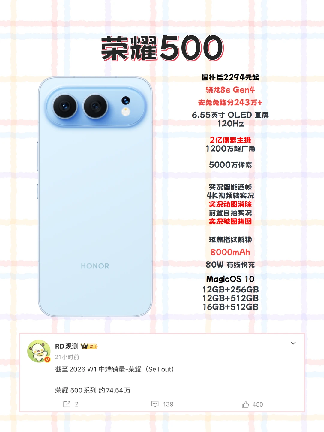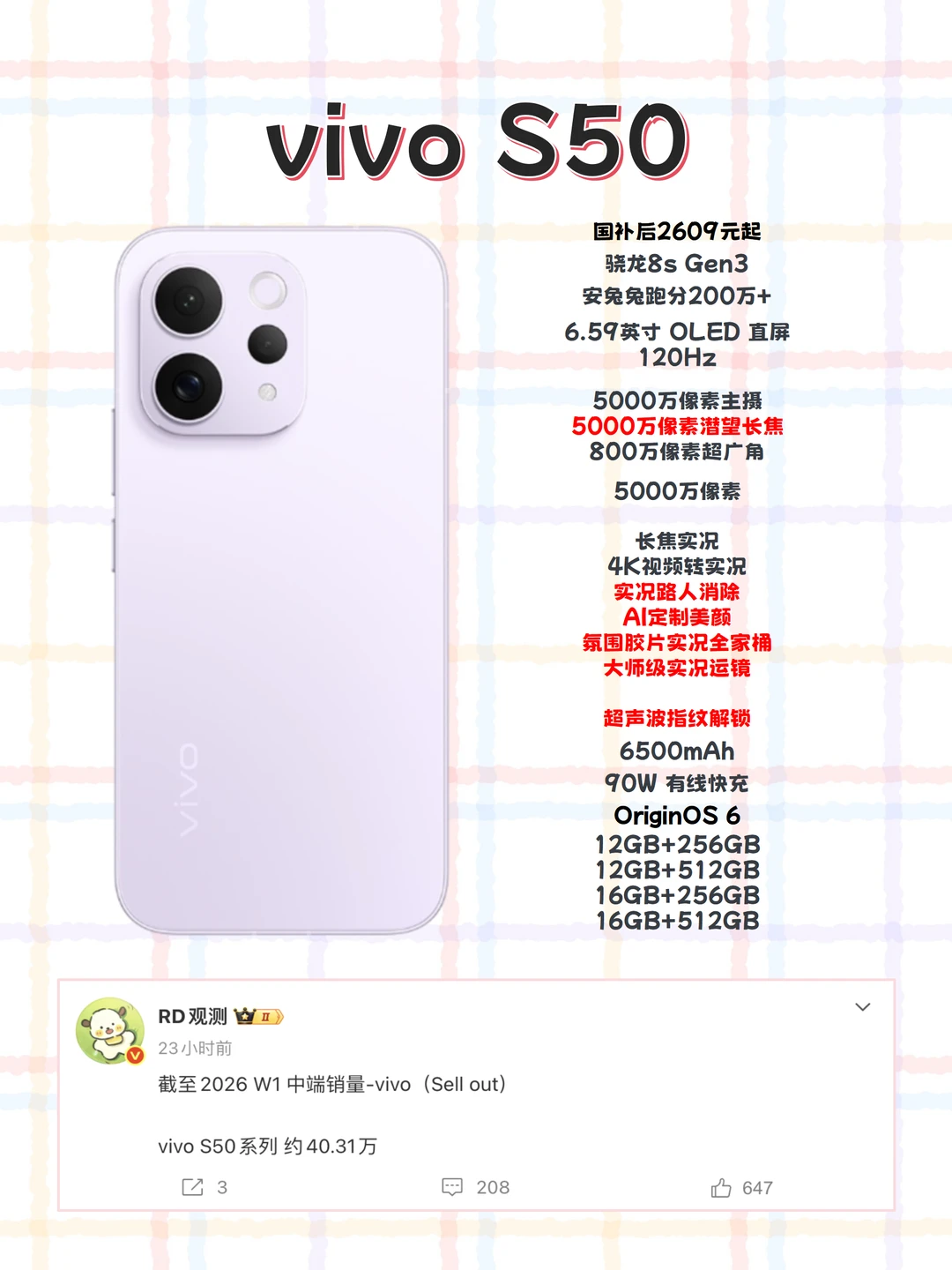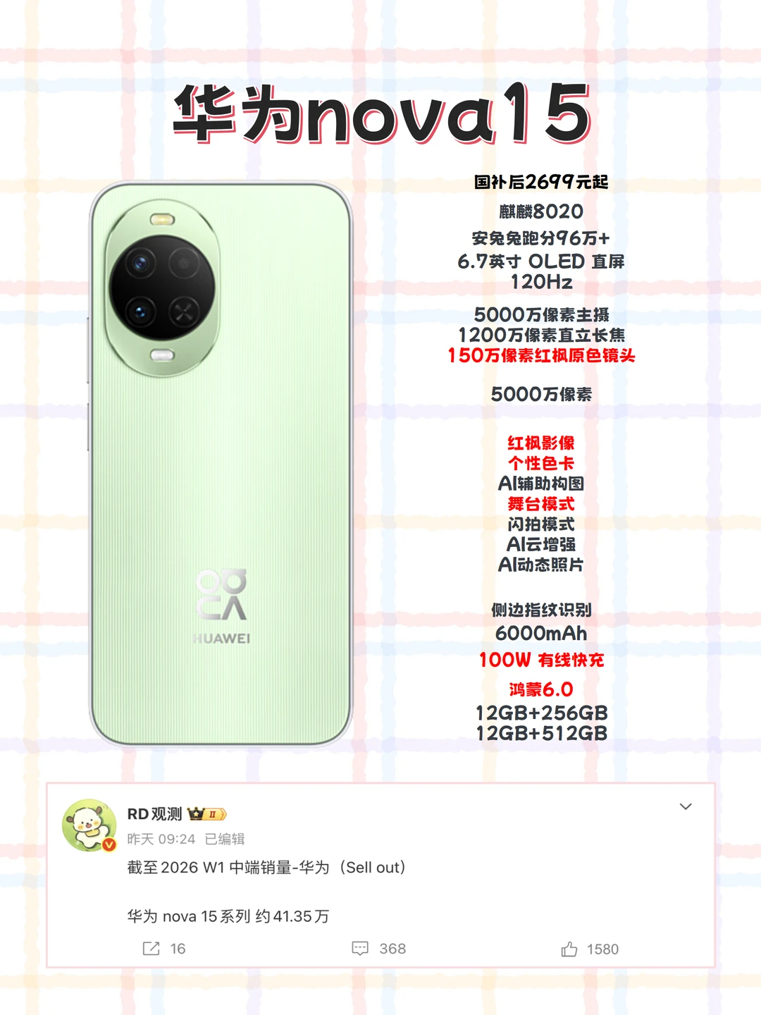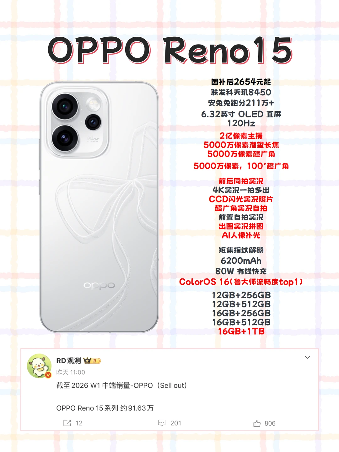 有没有正在寒假兼职或者实习的同学想过年前换新手机的? 考虑到很多大学生预算不高,但又想换台好用且能用久一点的手机,我给大家罗列几款国补3000左右的就能拿下的新机~ -- 📱华为nova15:麒麟芯+鸿蒙6.0系统,拍照自带红枫原色镜头,色彩还原真实自然。这机子适合想尝鲜鸿蒙生态的宝子。 -- 🔋荣耀500:这机子有8000mAh大电池,重度用一天无压力,骁龙8s Gen4处理器性能够强,玩游戏也够用,对续航、性能有要求的同学闭眼入。 -- 📸OPPO Reno15:这机子给了2亿主摄+5000万潜望长焦+5000万超广角,而且支持CCD闪光实况+出圈实况拼图,是四款机型里实况照片玩法👄多的! 天玑8450处理器跑分比骁龙8s Gen3高,主流游戏都能畅玩。加上ColorOS16系统也很丝滑,适合追求拍照记录生活的同学!有统计说这机子销量约91.63万,大幅领先同价位其他机型。 -- 🌟vivo S50:5000万主摄+5000万潜望长焦+800万超广角,拍人拍景都好用;骁龙8s Gen3芯片性能可以,橘子系统也很流畅,支持超声波指纹解锁,选它也不错~ 四款机子各有特色,设计颜值都符合年轻人胃口,趁着国补入手就挺不错~ 目前看销量的话,是Reno15卖得比较好,如果不知道怎么选,那就选卖得好人气高的是不会错的~