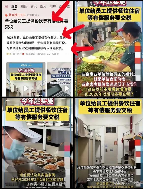 打工人的福利包吃包住可能要变样了。 今年起单位企业给员工提供食堂、宿舍这类“有偿福利”要按市场价缴纳约6%的增值税了。这意味着,15元的工作餐可能涨到近16元,300元的宿舍月租也会多出近20元,员工到手的隐形福利悄悄“缩水”。 对企业来说,这相当于成本增加。一些小企业主直呼“一份盒饭扒两层皮”——如果食堂已外包给第三方公司(第三方已交税),公司再向员工收费,就可能涉及重复缴税的问题。为了应对,有些企业开始琢磨变通办法,比如考虑将“有偿”改为“无偿”福利,或者索性全部交给外包公司打理。 这新规本意是让税收更规范,堵住一些企业用“白菜价福利”来降低社保缴费基数的漏洞。但直接落地,可能让员工最后的实惠被打折。眼下,有的打工人已经开始带饭,“拼宿舍”的帖子也多了起来。政策初衷是好的,但或许需要更细致的配套方案,别让好政策在落地时变成“割肉刀”。毕竟,稳住员工的基本生活需求,才能稳住企业的心。