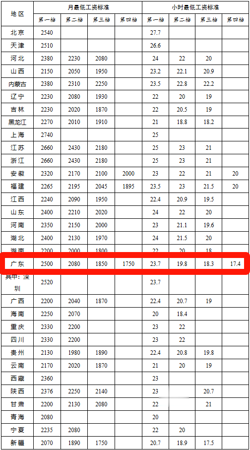 广东省月最低工资标准方面