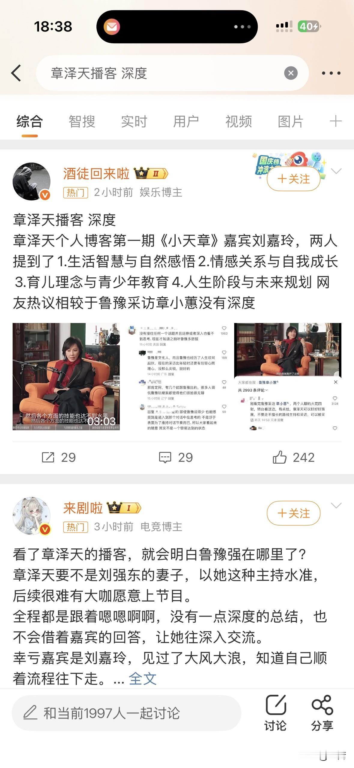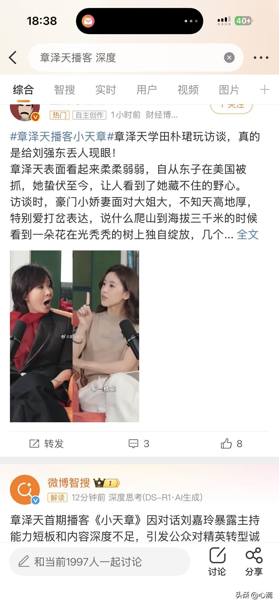 发酵了一天,不让孩子看社交媒体的章泽天,还是不出意外的出了意外,章泽天分担了田朴珺阵营的火力压力,以一己之力转移了了全网对王石两公婆的关注。 看了大量评论,网友的反应越来越出奇的一致,章泽天这一次在播客浮出社交媒体的水面看来是一次不算成功的尝试,出师不利啊! 镜头上的章泽天,好看是好看,但言之无物,那种清高和飘忽,那种在教育上露出的执念和强势,那种阶级固化的感觉,的确一言难尽。按这不断跳水的风评,希望她也和孩子们一起,坚决不看社交媒体,如此物理性隔绝,想来东哥和京东也不受影响。 既然对社交媒体那么避之不及,为什么章泽天还要在社交媒体上如此亮相呢?