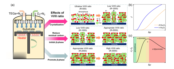 图2(a)Ⅵ/Ⅲratio对Ga2O3薄膜异质外延生长影响的示意图;(b)随着过饱和能∆μ增加,β-与κ-Ga2O3成核概率J的对比模型;(c)Jκ与Jβ之间差值的变化趋势,用于阐明β-Ga2O3的抑制与复现机制