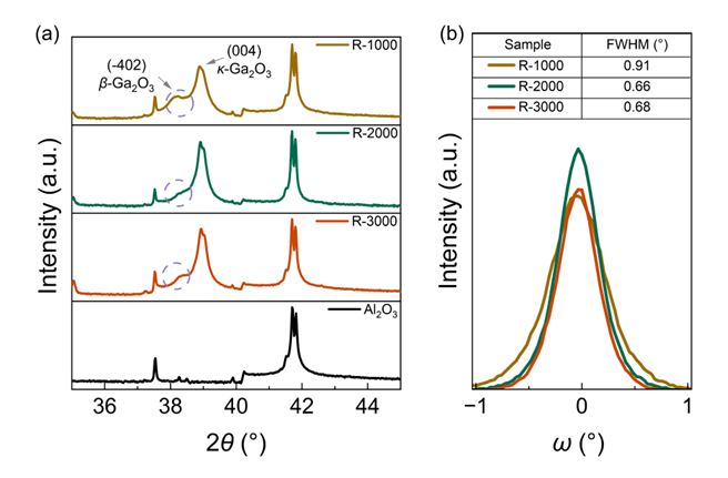 图1(a)Ⅵ/Ⅲratio分别为1000,2000,3000的样品的精细XRD衍射图;(b)对应样品的κ-Ga2O3(002)晶面的摇摆曲线