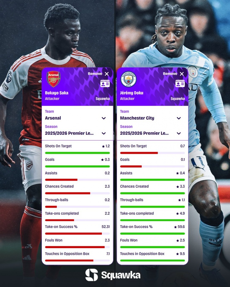 直播吧1月14日讯Squawka统计了萨卡、多库本赛季英超的每90分钟数据,并作出对比。