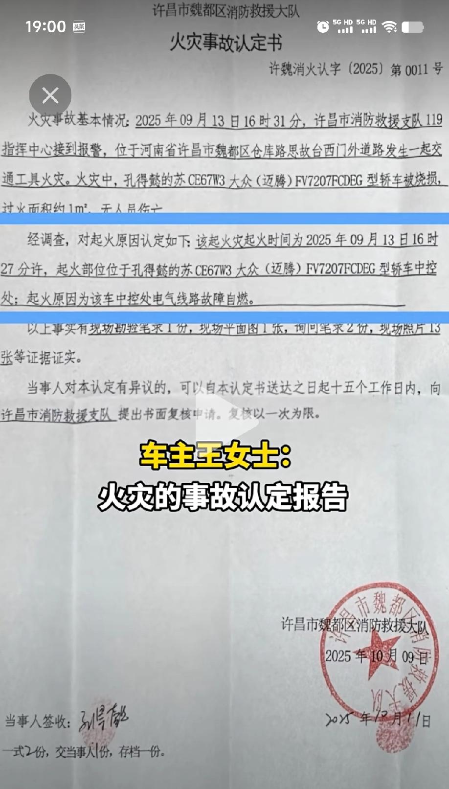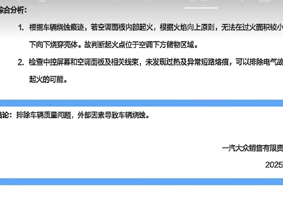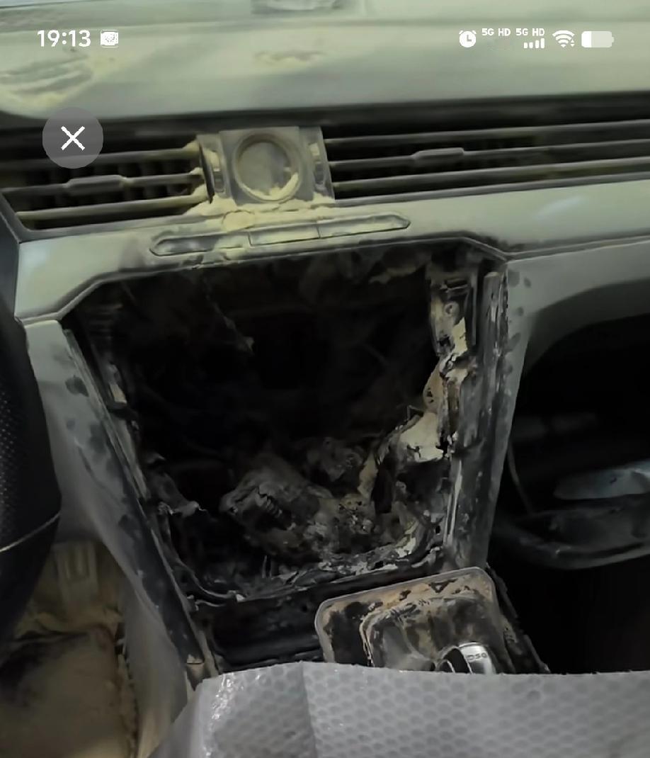 消防队说线路故障,厂家说外在因素,一汽大众迈腾中控起火,究竟是自燃还是外在因素。 刚才刷到一旧闻,一辆迈腾车在行驶过程中控处突然起火,好在及时被热心市民用灭火器熄灭。随后消防队到场,开具了线路故障自燃的书面报告。 因为这辆车没过三年质保期,于是车主把车拉到了4S店讨要说法。一汽大众4S店直接请来了厂家技术人员,经过实车检测后,却得出来一个非质量问题,外在因素导致的结果。 于是车主不高兴了,消防队这么专业的报告都出了,你生产厂家不接受,分明是在推诿。 咱不乱下结论,不说谁对谁错,用事实说话。 这辆车是2022年10月1号出厂,因为23款是2022年10月10号才上市,所以对应的车型应该是21款30周年纪念版。 首先通过发布出来的现场图片来看,起火点只有中控屏跟空调面板集中位置,就连上边的时钟都没有烧到,然后根据一汽大众报告里提到的储物盒胶垫完整,胶垫上方偏左上方位置塑料烧穿,可以说明这个位置就是最初的起火点。 然后再来看一下这款车这个位置有什么,通过实车图片可以看出来,这个位置没有任何用电设备。而且这个地方一般都是放车钥匙、火机、手机等,但如果真是这些东西引起的起火,能把中控屏都点燃,胶垫早就烧毁了。 而且根据常识,无论是充电插头还是空调控制面板和显示屏,都有单独的保险丝,如果是线路短路,保险丝一定会断,而且就算是保险丝不断,短路造成的起火很容易分辨,一整条线路都有大电流烧灼的痕迹。 所以说这辆车厂家的结论不属于质量问题理论上没啥异议,但胶垫完整,似乎证明又不像是用户造成的结果,所以厂家的定论是外部因素造成。 其实大众都有送原厂记录仪的惯例,只要用户不设定关闭音频,想要知道真相就很容易了。汽车 @汽车天涯 @汽车之家 @懂车帝原创