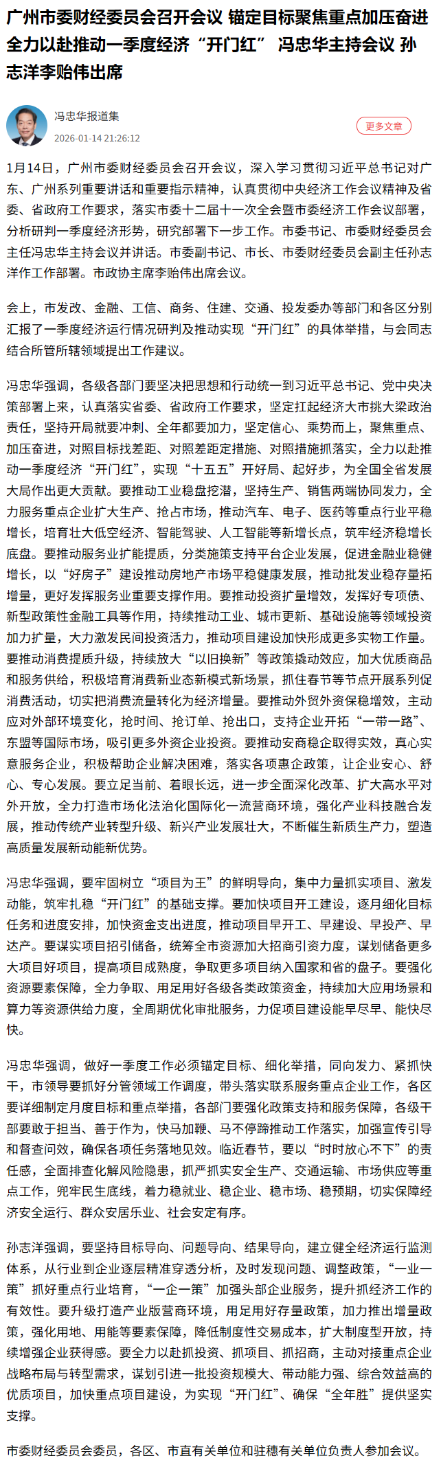 1月14日,广州市委财经委员会召开会议。市委书记、市委财经委员会主任冯忠华强调,要推动工业稳盘挖潜,坚持生产、销售两端协同发力,全力服务重点企业扩大生产、抢占市场,推动汽车、电子、医药等重点行业平稳增长,培育壮大低空经济、智能驾驶、人工智能等新增长点,筑牢经济稳增长底盘。要推动服务业扩能提质,分类施策支持平台企业发展,促进金融业稳健增长,以“好房子”建设推动房地产市场平稳健康发展,推动批发业稳存量拓增量,更好发挥服务业重要支撑作用。要推动投资扩量增效,发挥好专项债、新型政策性金融工具等作用,持续推动工业、城市更新、基础设施等领域投资加力扩量,大力激发民间投资活力,推动项目建设加快形成更多实物工作量。