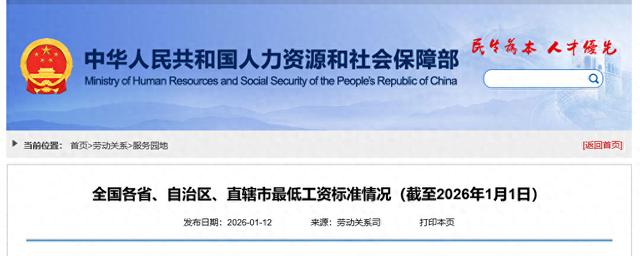 1月12日,中华人民共和国人力资源和社会保障部官网公布全国各省、自治区、直辖市最低工资标准情况(截至2026年1月1日)。