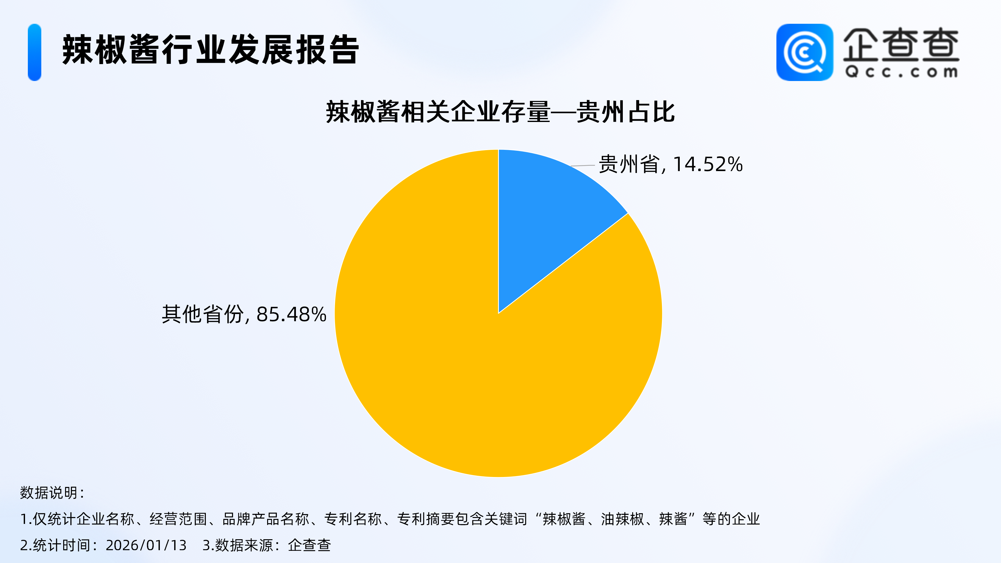 企查查数据显示,从省份分布来看,分布在贵州省的辣椒酱相关企业最多,占全国存量的14.52%。其次,山东省相关企业存量占比12.65%,位列第二。其他省份占比均不足10%。据央视新闻去年10月报道,贵州以504万亩的种植规模、729万吨的年产量,连续多年稳居行业首位,带动超140万椒农户均年增收1.8万元。其中,贵州油辣椒占据国内市场70%,糟辣椒、泡椒成为贵州辣椒新增长点。