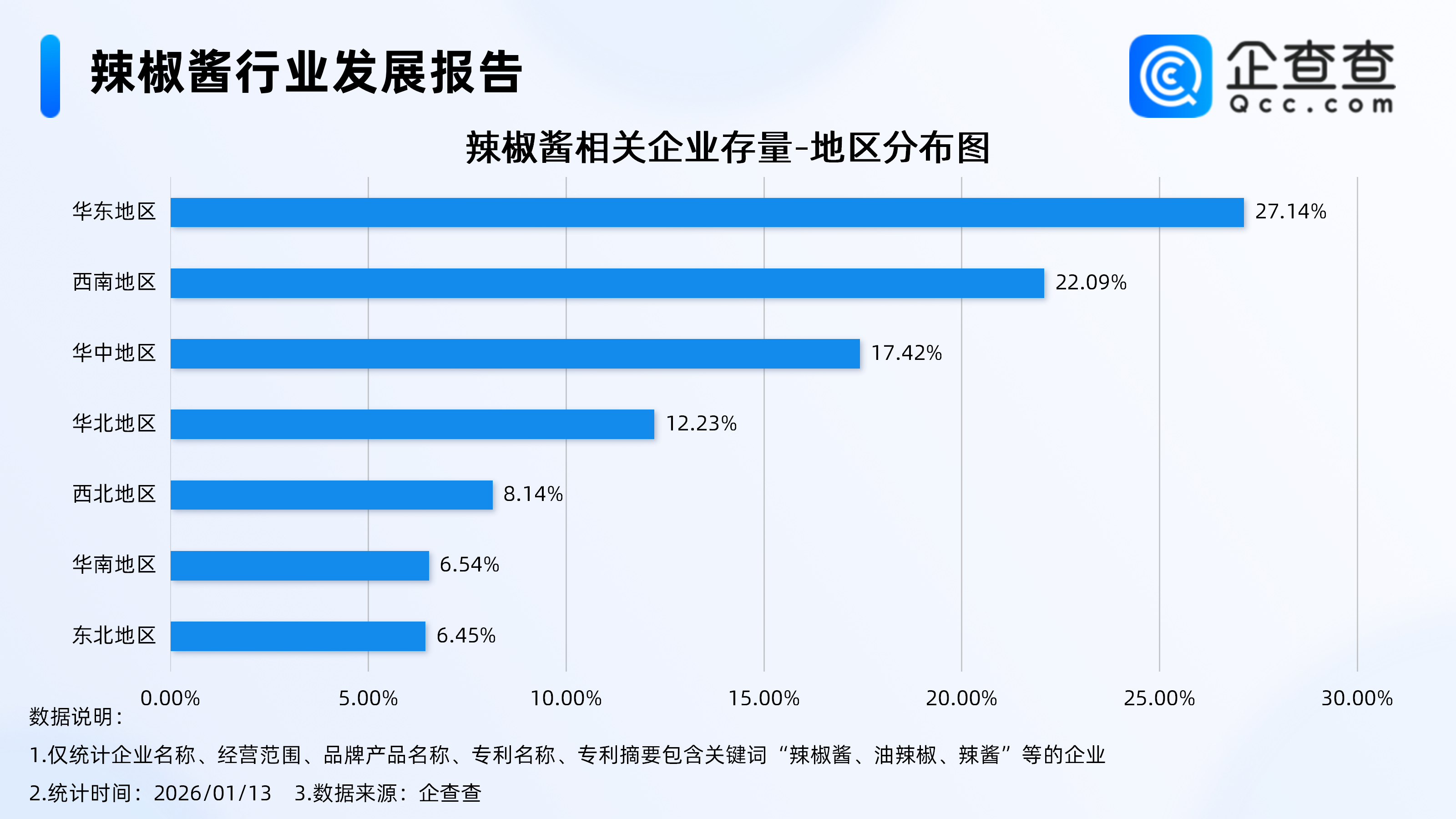 企查查数据显示,从地区分布来看,分布在华东地区的辣椒酱相关企业最多,占比27.14%。其次,分布在西南地区、华中地区的相关企业分别占比22.09%、17.42%。