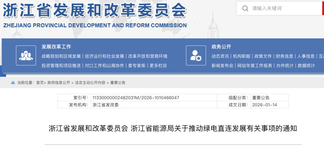 1月14日,浙江省发展和改革委员会、浙江省能源局发布关于推动绿电直连发展有关事项的通知,通知指出: