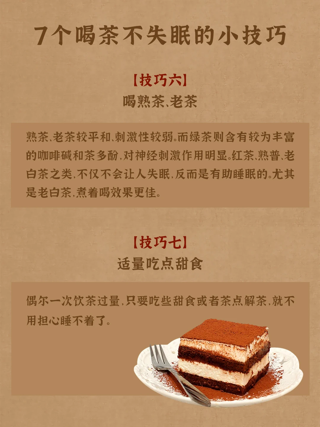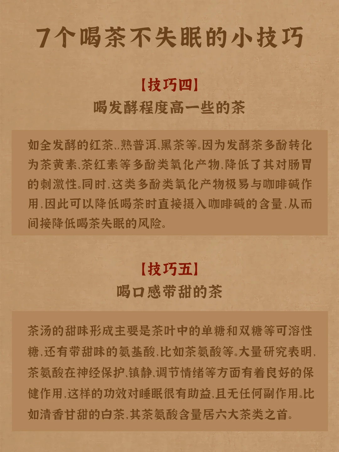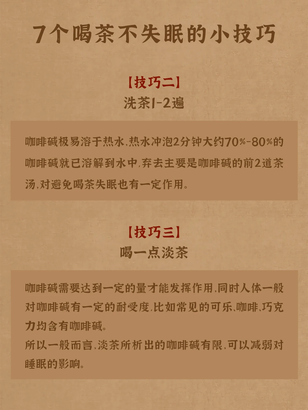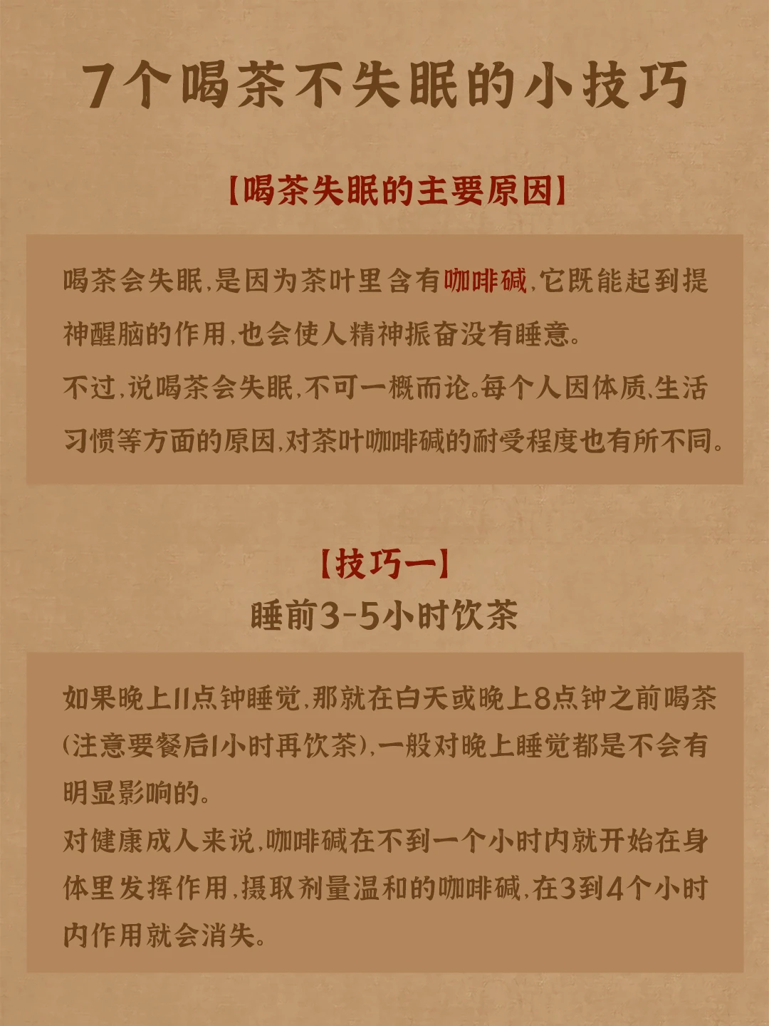 总说"喝茶失眠"?是你打开方式不对!本10年茶瘾教你7个喝茶不失眠小技巧 🌟核心科技:茶氨酸VS咖啡因の攻防战 ✅黄金时间切割法:前30秒倒掉首泡,扔掉70%咖啡因 ✅冷萃封印术:冷水泡6小时,咖啡因少3倍! 💡7招科学饮茶公式 1.睡前3-5小时饮茶 2.洗茶1-2遍 3.喝一点淡茶 4.喝发酵程度高一些的茶 5.喝口感带甜的茶 6.喝熟茶、老茶 7.适量吃点甜食