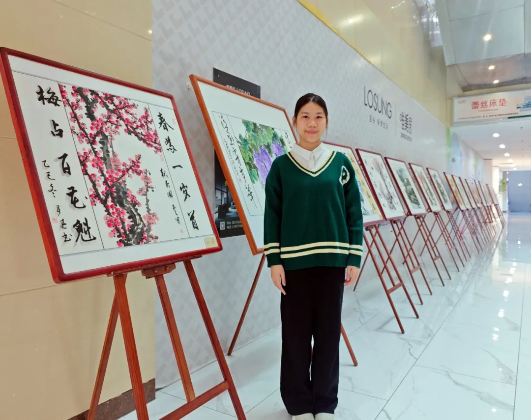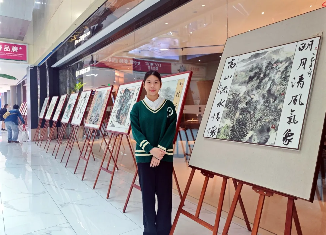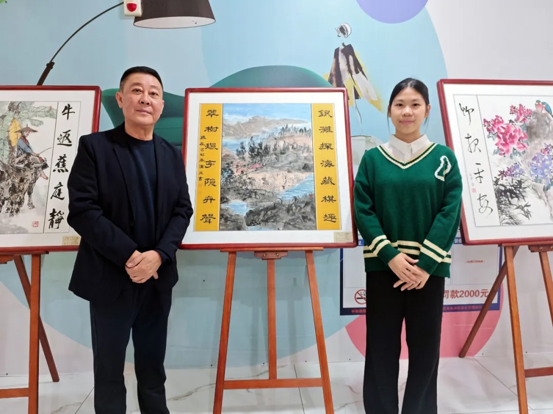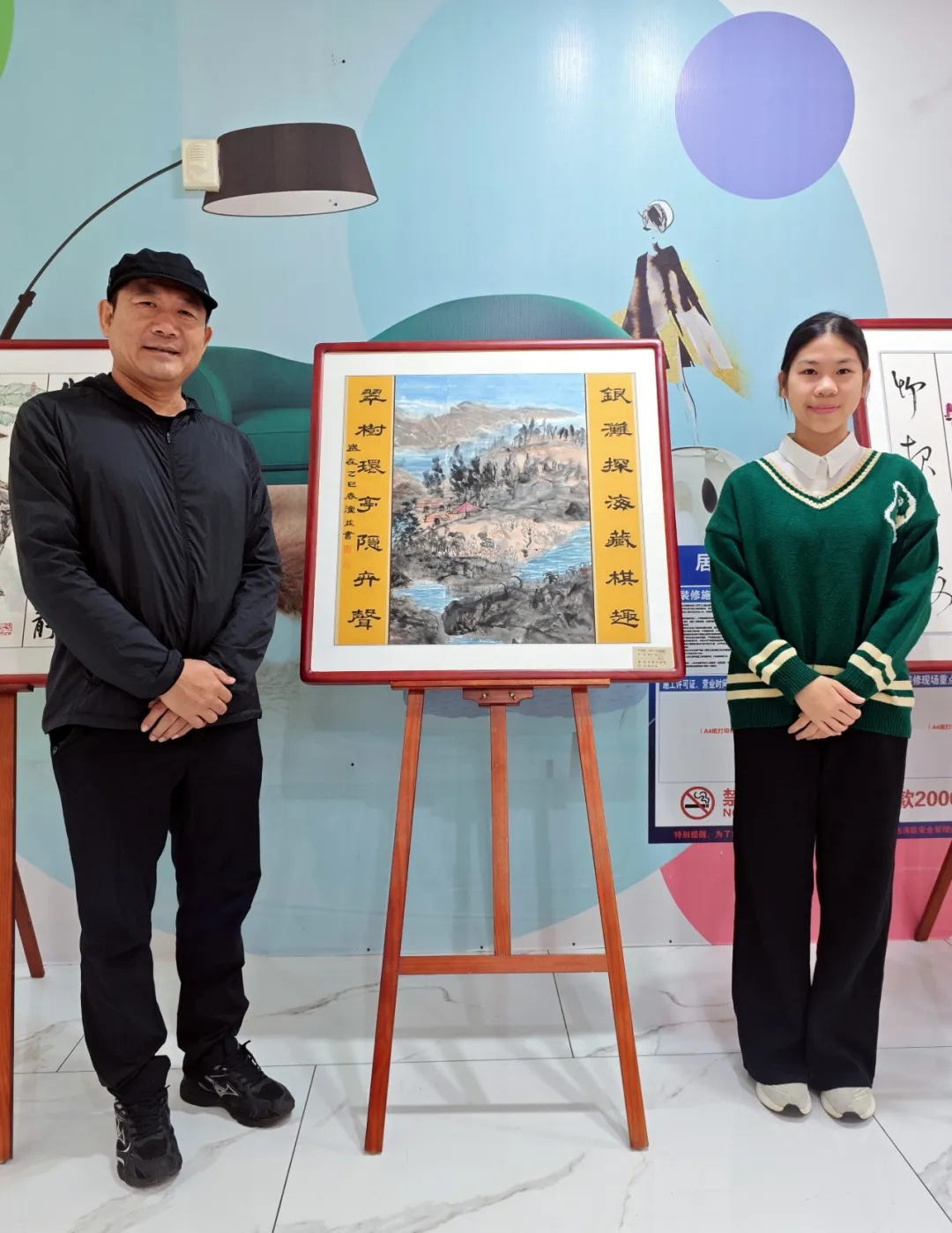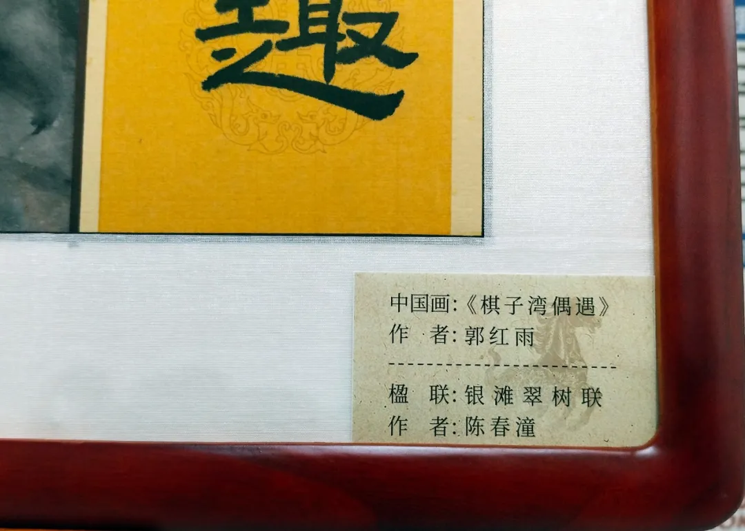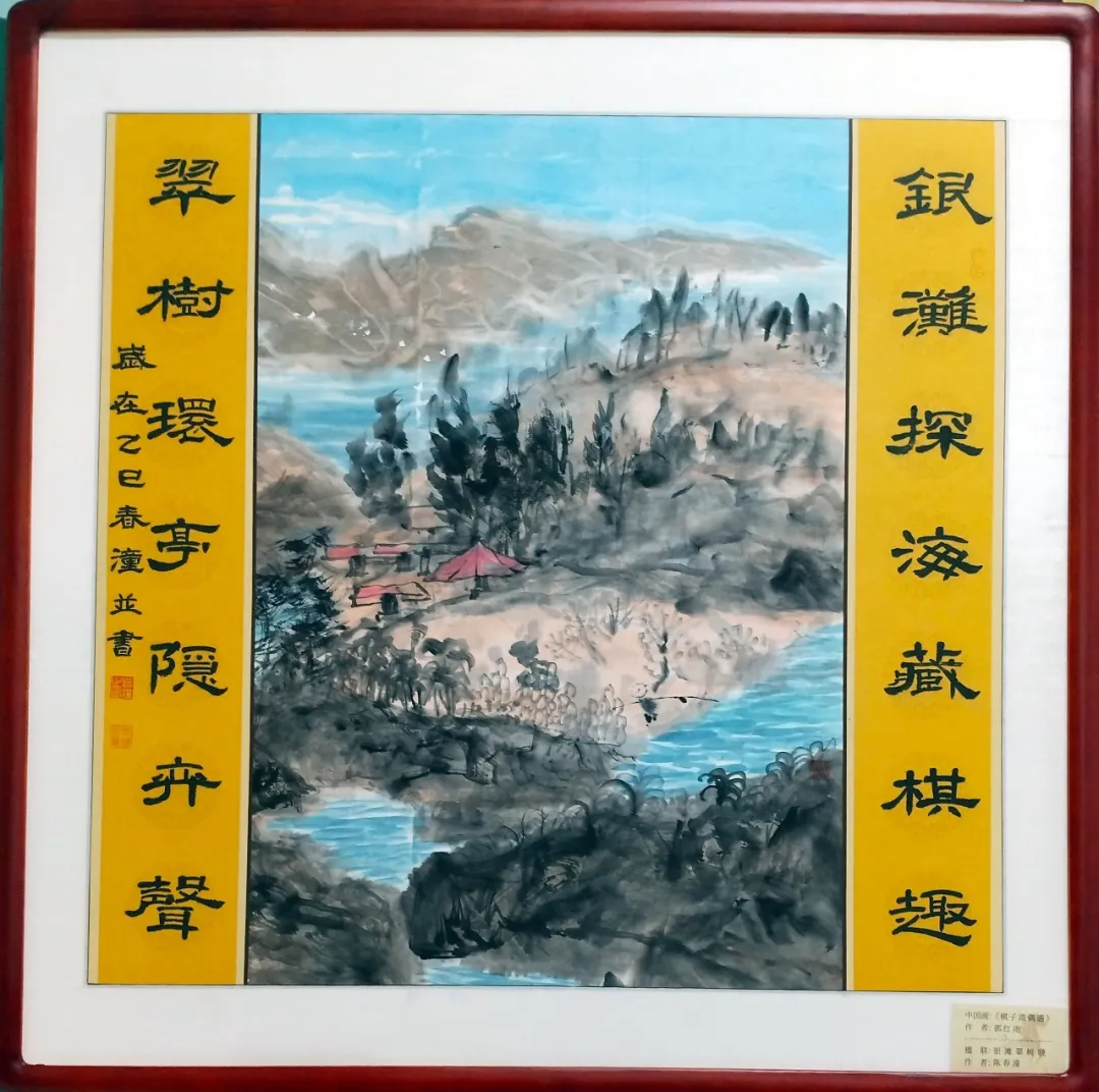 海南省楹联学会会员、海南省硬笔书法家协会会员陈春潼撰联并精心创作的隶书楹联书法作品《银滩探海藏棋趣,翠树环亭隐弈声》,与中国美术家协会会员、海南省美术家协会副主席、海南师范大学美术学院教授郭红雨创作的国画作品《棋子湾偶遇》,同框装裱展出。