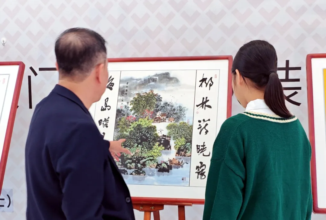 在同框展出的书画作品前,陈春潼向郭红雨副主席介绍合作参展的楹联书法作品创作情况。