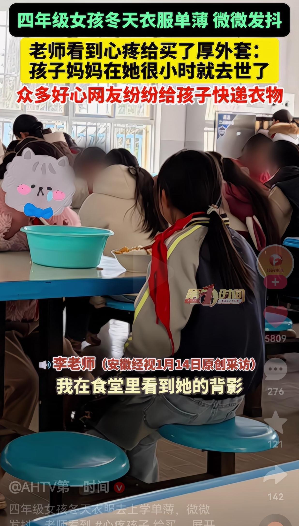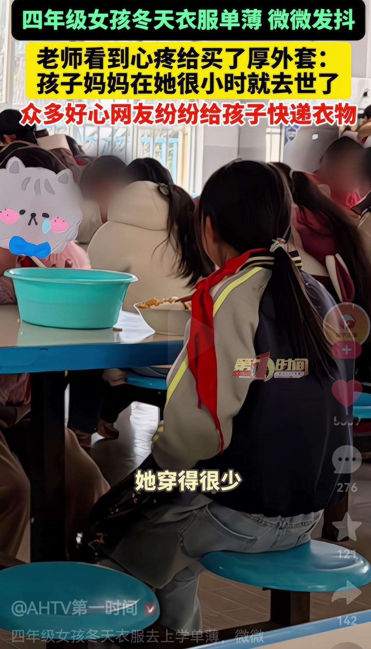 还是好人多呀!云南一女孩在冬日里穿得有点单薄,浑身都在发抖,老师在食堂注意到了她,并拍了一张照片,发到了网上,没想到善意如潮水般涌来,一时间网友纷纷寄来包裹,给女孩送去温暖。 据李老师讲述,她是女孩的英语老师,那天雪下得特别大,她在食堂看到女孩的背影,穿得薄薄的,身子还在微微发抖,瞬间就心疼了。 她心里五味杂陈,当即就给孩子买了一件厚外套,想让她身体感受到温暖。。 同时,李老师把女孩的照片发到网上,并说明了女孩的情况,没想到就是这一举动,瞬间引发了无数好心网友的关注。 热心的网友纷纷私信李老师,有的想给孩子寄过冬的衣物,有的想资助孩子的学习生活,还有的网友特意询问地址,只想尽一份自己的心意。 短短几天的时间,李老师就陆陆续续收到了三四十个包裹,里面不光有厚实的棉衣、羽绒服,还有帽子、围巾、手套,甚至连牙膏、牙刷、鞋子这些生活用品都一应俱全。 贴心的网友还注意到了女孩的家庭情况,知道了孩子在很小的时候,妈妈就已经去世了。 还特意给小女孩寄了贴身的内衣裤、小背心,甚至还有卫生巾这类私密的生活物品,更有网友提出想要资助女孩的上学费用。 更让人暖心的是,李老师了解到班里还有另外两个家庭贫困的女孩后,征求了网友们的意见。 在征得网友的同意后,她又把多余的衣物分发给了这两个孩子,好心的网友也特意为她们寄来了衣服和鞋子。 网友看到后评论说:“没有妈妈的孩子,真的太可怜了,幸好遇到了这么多好心人,温暖了小女孩的心。” 还有的网友说:“网友们的爱心太让人感动了,这才是真正的人间烟火气。” 看完这个故事,心里暖暖的,小女孩的遭遇让人心疼,但幸好,她遇到了一个温柔的老师,还有一群素未谋面却满心关怀的网友。 这份跨越山海的善意,不仅给孩子送去了温暖,更让她感受到了来自陌生人的爱与牵挂。 最后,希望我们都能像这位李老师和好心网友一样,心怀善意与温暖,用自己的绵薄之力,照亮他人前行的路。