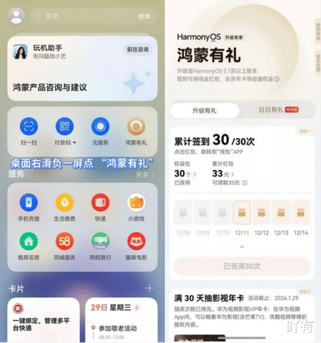 看完盛典之后速速升级了HarmonyOS 6,本想体验一番盛典上介绍的各种趣味功能,没想到还挖到了鸿蒙有礼这个宝藏活动——从桌面右滑至负一屏,戳“鸿蒙有礼”每天签到领随机红包和超值权益,不但有机会抽到3个月Petal One悦享套餐、爱奇艺、优酷、芒果tv和WPS等视频会员,还能在首签第30天后抽影视年卡和热门影音年卡。满足我的影音娱乐和办公等各种需求。