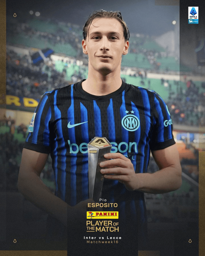 意甲官方:皮奥-埃斯波西托当选国际米兰vs莱切全场最佳球员