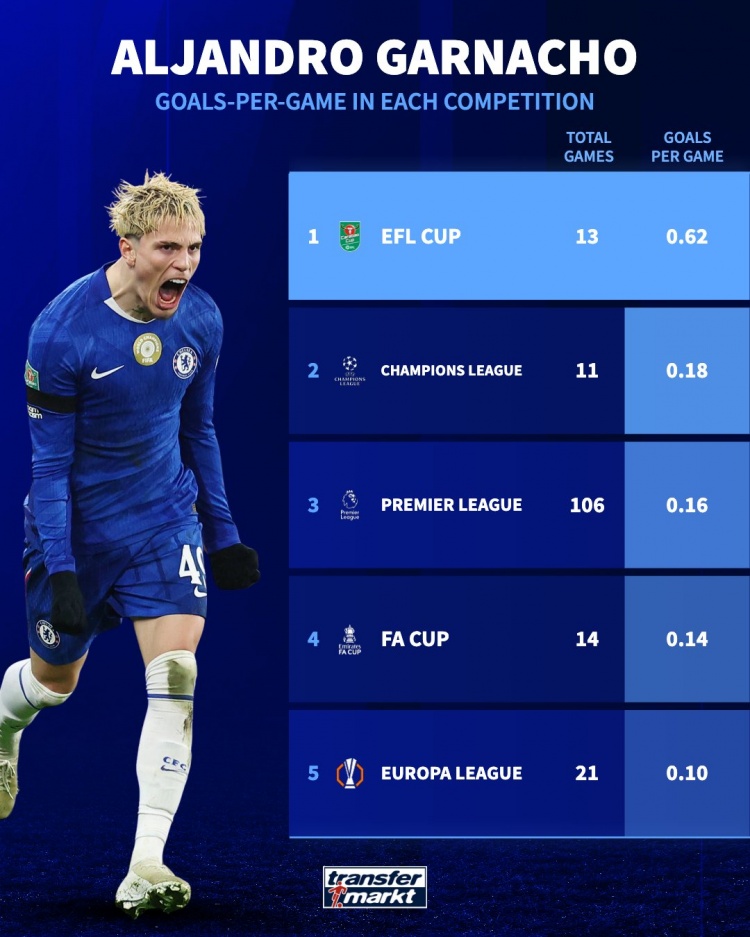 德国转会市场统计了加纳乔在各项赛事中的进球效率,他在联赛杯中场均打进0.62球,进球效率在他参加的赛事中最高。