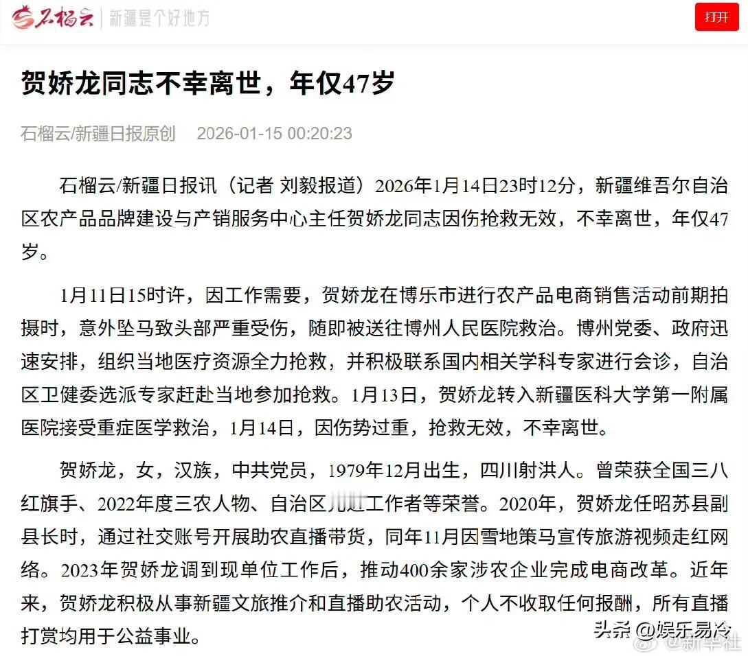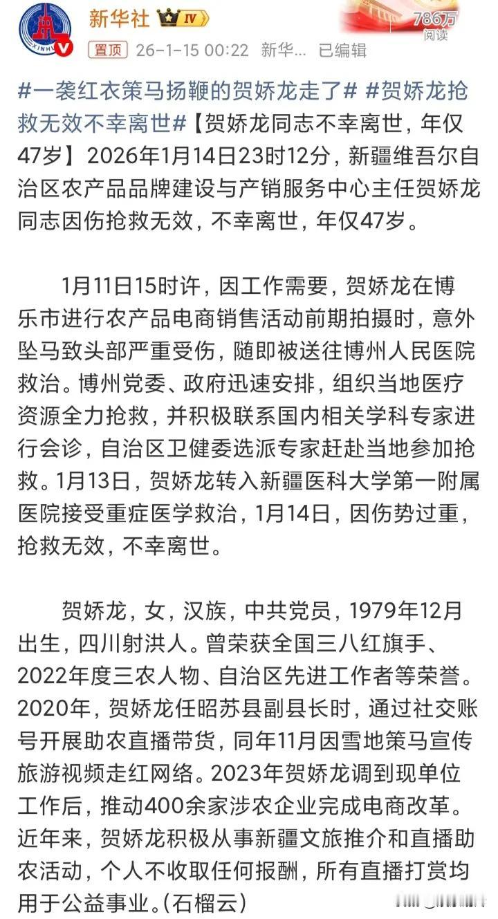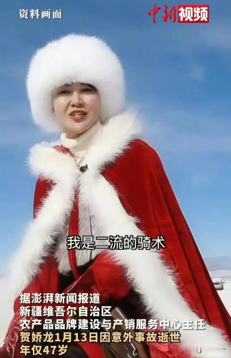 之前怀疑过贺娇龙是为了当网红才骑马,后来才发现她早就不止一次从马上摔下来了,之前摔断过骨头,这就证明了我的怀疑是错的,因为这个是之前就能预料到,是有一定危险的,而这一次很不幸摔到了头部。 不评价她骑马到底合不合适,但至少能感受到,她是真心在为新疆文旅和农副产品谋出路,她就是新疆人民、全国人民的骄傲!一路走好,马背上的玫瑰永不凋零!