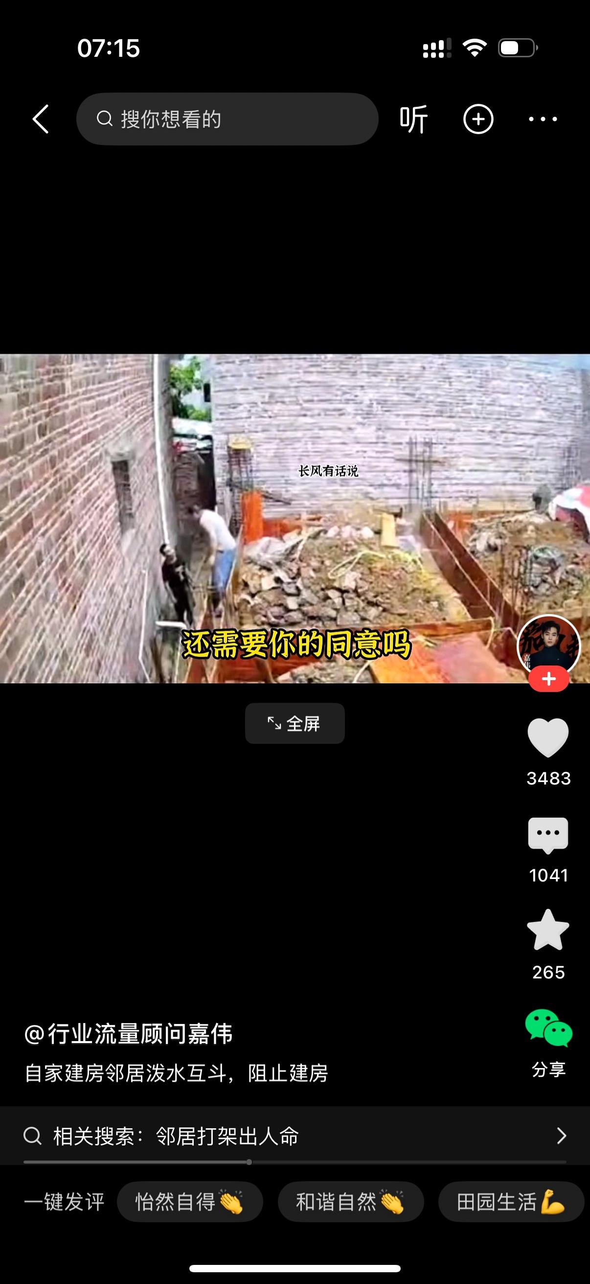 男子修建新房,隔壁邻居气势汹汹地走了过来斥责他,你们家建房影响我家的采光,赶紧停工。男子气不打一处来,我在自己的宅基地上建房子,还需要你同意吗?两个人就这样大吵起来。隔壁邻居的妻子在楼上泼了一盆水到男子身上,放言,看一次泼一次。男子被惹怒了,拿着砖头就往邻居家砸。邻居看到男子一反常态,不像以前那么老实,后面不再找麻烦。这就是欺软怕硬吧。