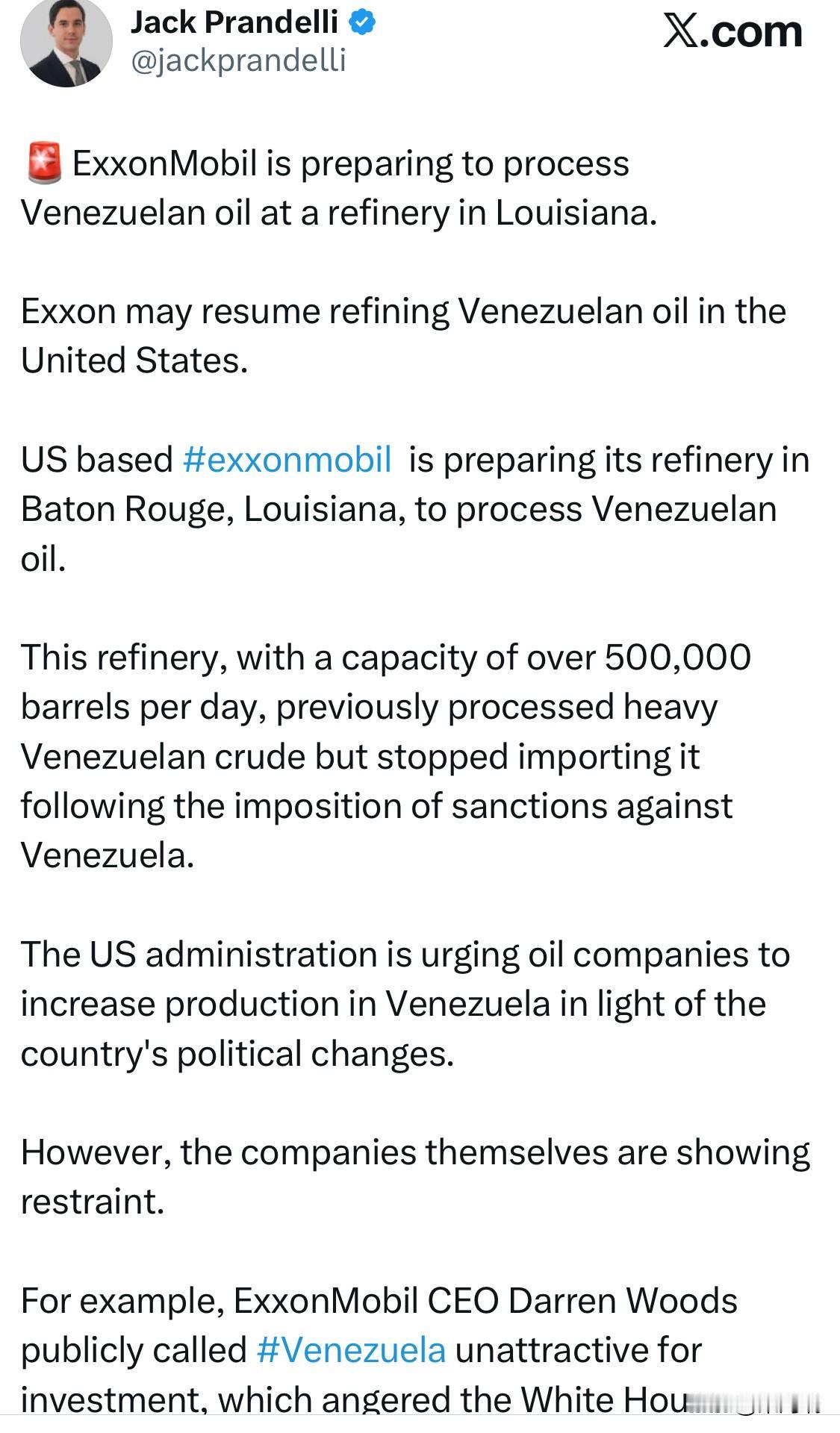 埃克森美孚正准备在路易斯安那州的一家炼油厂加工委内瑞拉石油。 埃克森美孚可能恢复在美国炼制委内瑞拉石油。 总部位于美国的埃克森美孚正在路易斯安那州巴吞鲁日的炼油厂进行委内瑞拉石油的加工准备工作。 这家炼油厂日产能超过 50 万桶,此前加工委内瑞拉重质原油,但在对委内瑞拉实施制裁后停止进口委内瑞拉原油。 鉴于委内瑞拉的政治变革,美国政府敦促石油公司增加在委内瑞拉的石油产量。 然而,这些公司本身却表现得十分克制。 例如,埃克森美孚首席执行官达伦·伍兹公开称委内瑞拉不具投资吸引力,这激怒了白宫。