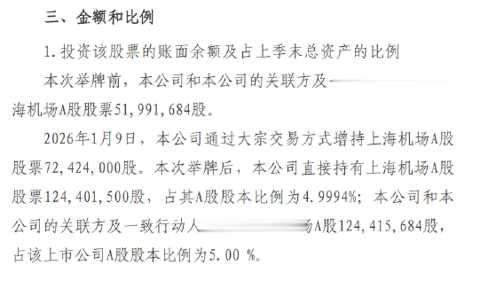 1月15日金融一线消息,中国太平洋人寿保险股份有限公司(下称太保寿险)发布公告称,2026年1月9日,该公司通过大宗交易方式增持上海机场(600009.SH)A股股票7242.4万股。本次举牌后,太保寿险及其关联方及一致行动人太平洋资产管理有限责任公司共持有上海机场A股约1.24亿股,占该上海机场A股股本比例为5.00%。