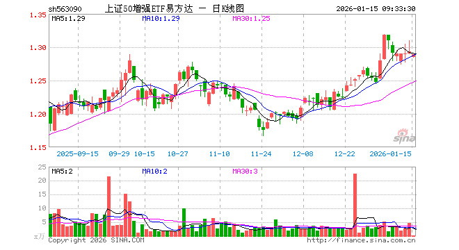1月15日,上证50增强ETF易方达(563090)开盘跌0.62%,报1.285元。上证50增强ETF易方达(563090)重仓股方面,贵州茅台开盘跌0.14%,中国平安跌0.15%,药明康德跌0.38%,海尔智家跌0.42%,深南电路跌1.27%,澜起科技涨0.26%,沪电股份跌0.53%,紫金矿业跌0.62%,豪威集团跌0.07%,国泰海通跌0.48%。