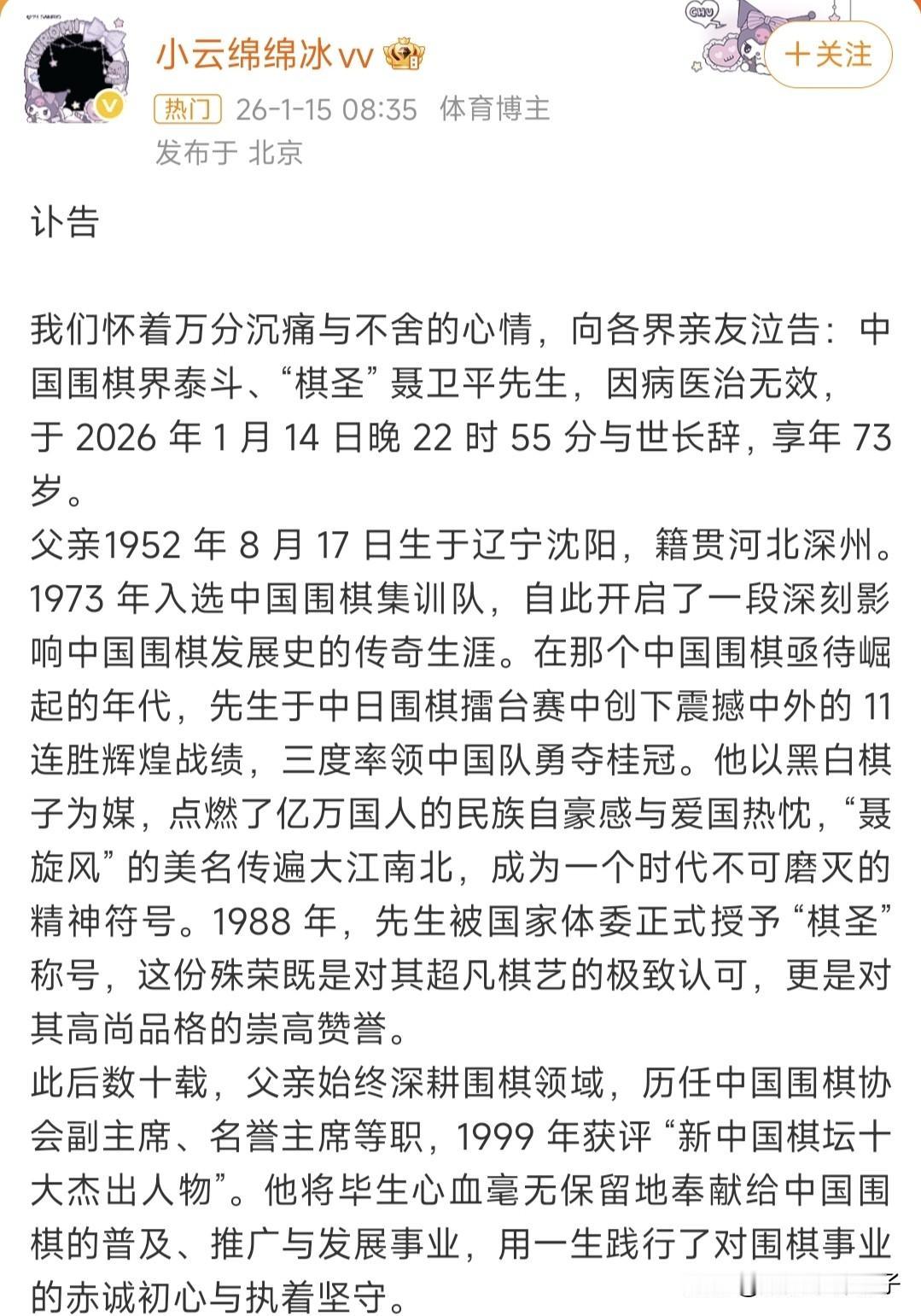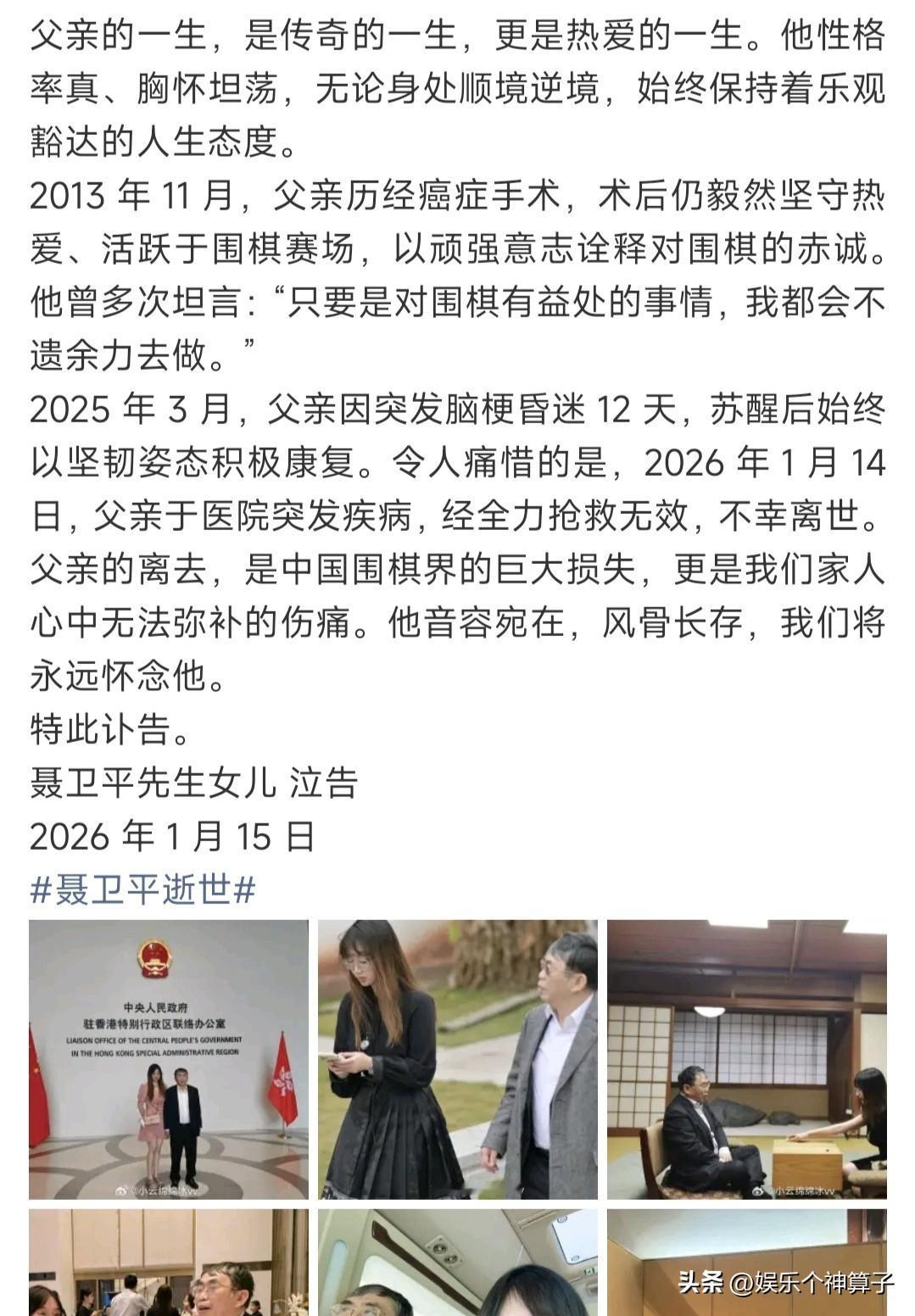 “棋圣” 聂卫平去世,女儿发文透露细节,晒患病期间照片! 1月15日,一大早,就听到聂卫平去世的消息,感觉有点突然,猝不及防,老爷子73岁,说实话,年龄并不算大。 女儿在社交平台发布讣告,悼念聂卫平,用了围棋界泰斗,“棋圣”来形容,可见对老父亲的尊重和崇拜。 据聂卫平女儿透露,2025年3月,老爷子突发脑梗昏迷12天,一直积极康复。 2026年1月14日,于医院突发疾病,抢救无效,不幸离世。 这样看来,老先生一直在努力的康复,真的好有毅力,期间还忘不了围棋。 女儿还分享聂卫平患病期间的照片,老先生坐着轮椅,身上穿病服,状态看起来并不算好,女儿在一旁悉心照顾。 话说,感觉聂卫平女儿的年龄不大,失去了父亲,一定很难过,心情可想而知。 毫不夸张的说,聂老的去世,是围棋界的一大损失。 愿逝者安息,一路走好!