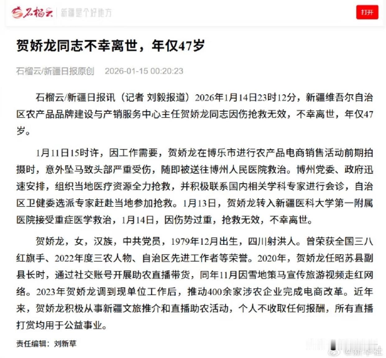 马背上的贺主任走了! 看到贺娇龙主任离世的消息,心里揪得慌。 才47岁啊,多好的年纪!那个在雪地里策马奔腾的姑娘,用直播把新疆的好物、美景带向全国,实实在在帮老乡们增收。 她做公益不图名不图利,直播打赏全捐,还推动几百家涉农企业搞电商改革。明明是干部,却没一点架子,接地气得像身边的大姐。 意外坠马真的太突然了,这么好的人说走就走,太让人惋惜。 她用行动告诉我们,真正的为民服务,从来不是喊口号,而是踏踏实实干实事。 贺主任一路走好,感谢你为新疆付出的一切。 你的善意和努力,我们都会记得,新疆的草原和瓜果,也会永远念着你!贺娇龙