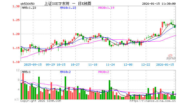 1月15日,截止午间收盘,上证50ETF东财(530050)跌0.81%,报1.221元,成交额155.52万元。上证50ETF东财(530050)重仓股方面,贵州茅台截止午盘跌0.47%,中国平安涨0.36%,招商银行涨0.37%,紫金矿业涨0.52%,长江电力涨0.30%,兴业银行跌0.10%,恒瑞医药跌1.37%,中信证券涨0.21%,寒武纪跌2.99%,药明康德涨0.44%。